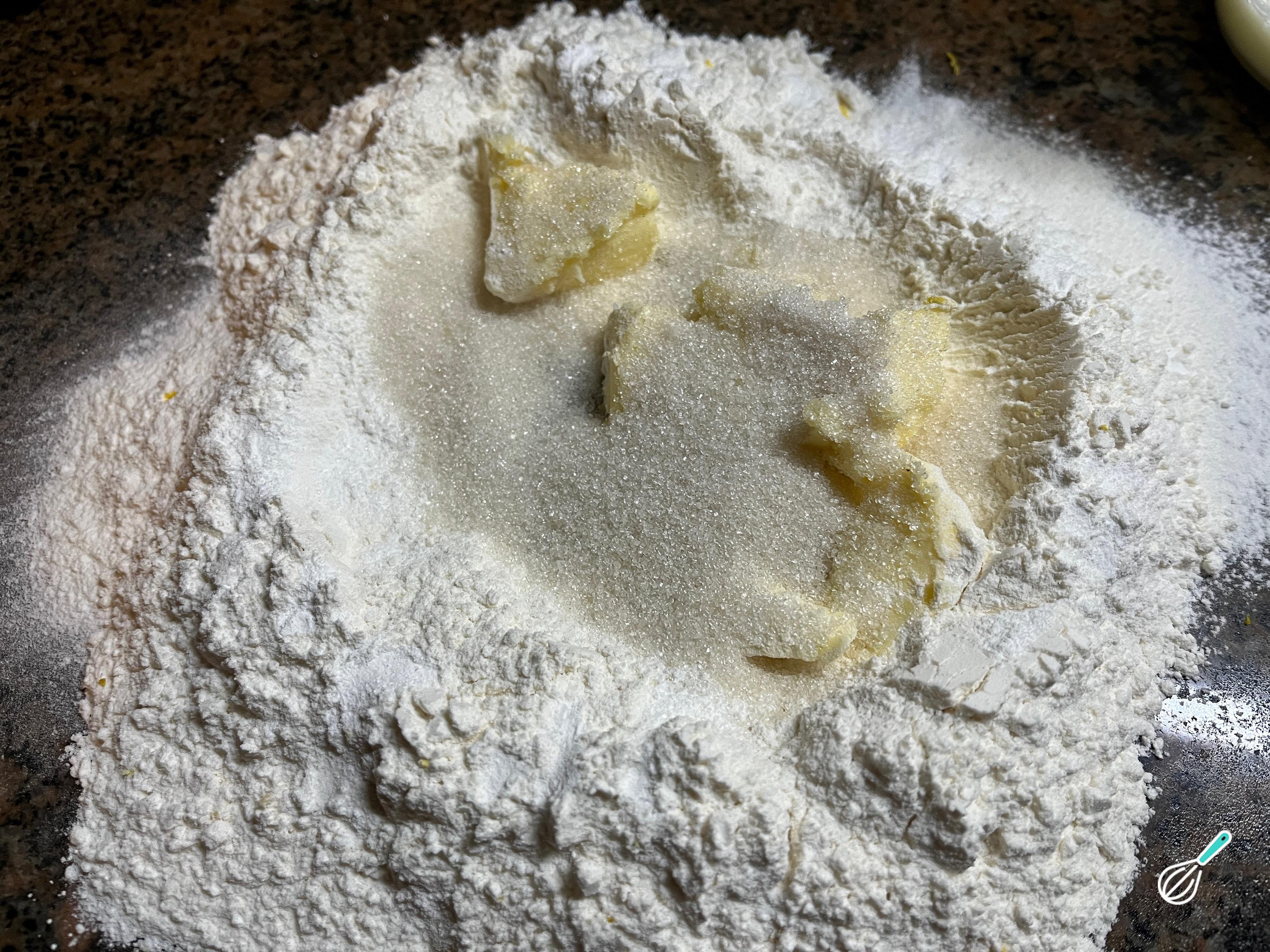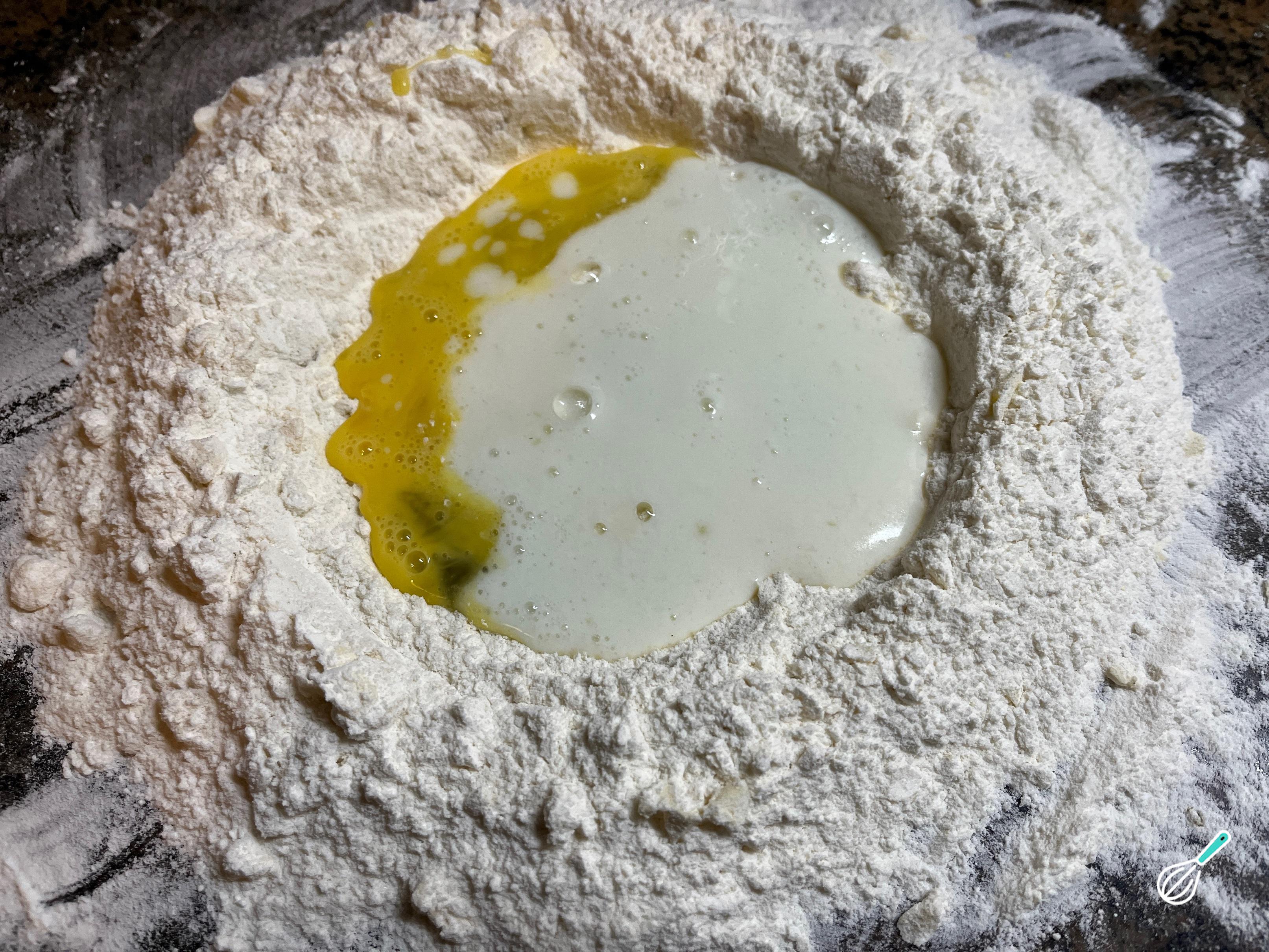 A seguir, faça um buraco no centro como se fosse um vulcão, para adicionar o ovo, a raspa de limão, a essência de baunilha e o leite. Integre cuidadosamente do centro para fora para formar a massa de seus scones ou muffins ingleses. Nesta etapa recomendamos não sovar ou desenvolver glúten, tornando-os um pouco firmes. Em vez disso, procuramos apenas integrar os ingredientes para formar uma massa úmida.