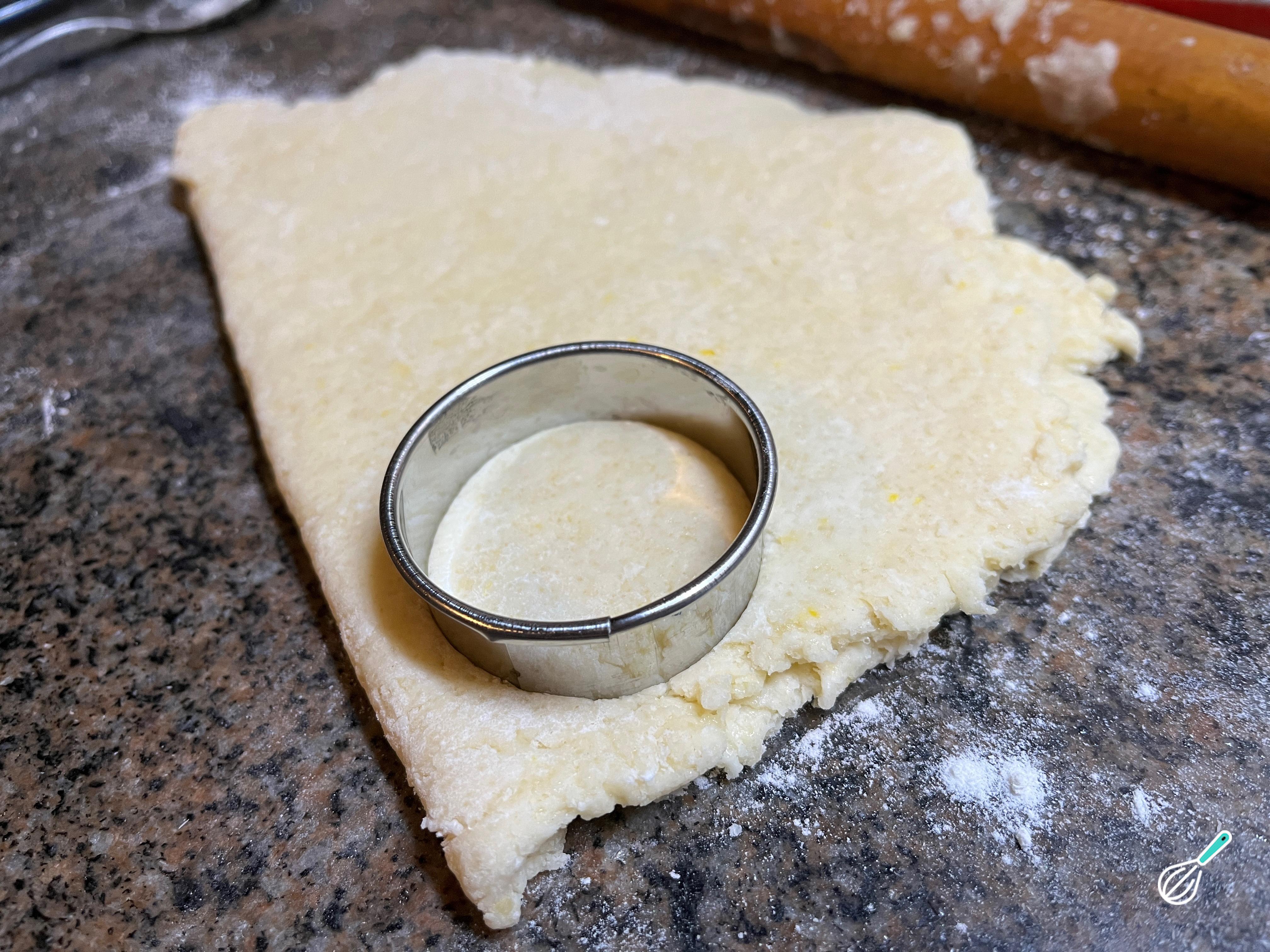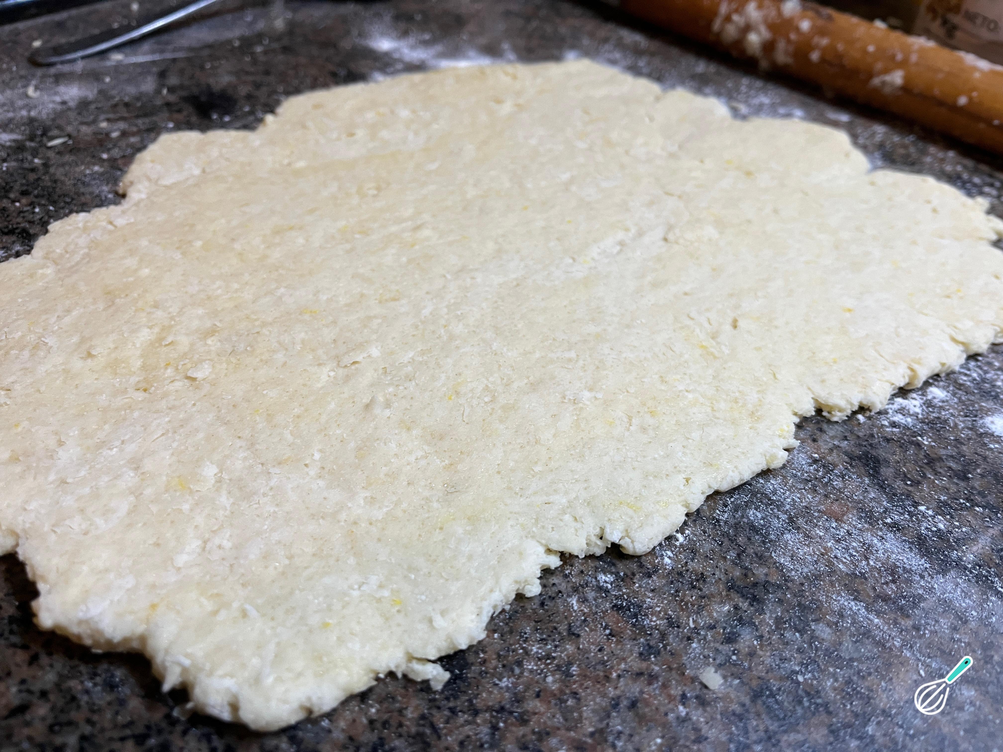 Depois de integrada, estenda a massa para os seus scones. Deve ter cerca de meio centímetro de espessura. Você pode enfarinhar o fundo da bancada limpa para não grudar, depois umedecer a superfície com leite ou manteiga derretida e dobrar a massa como um livro.