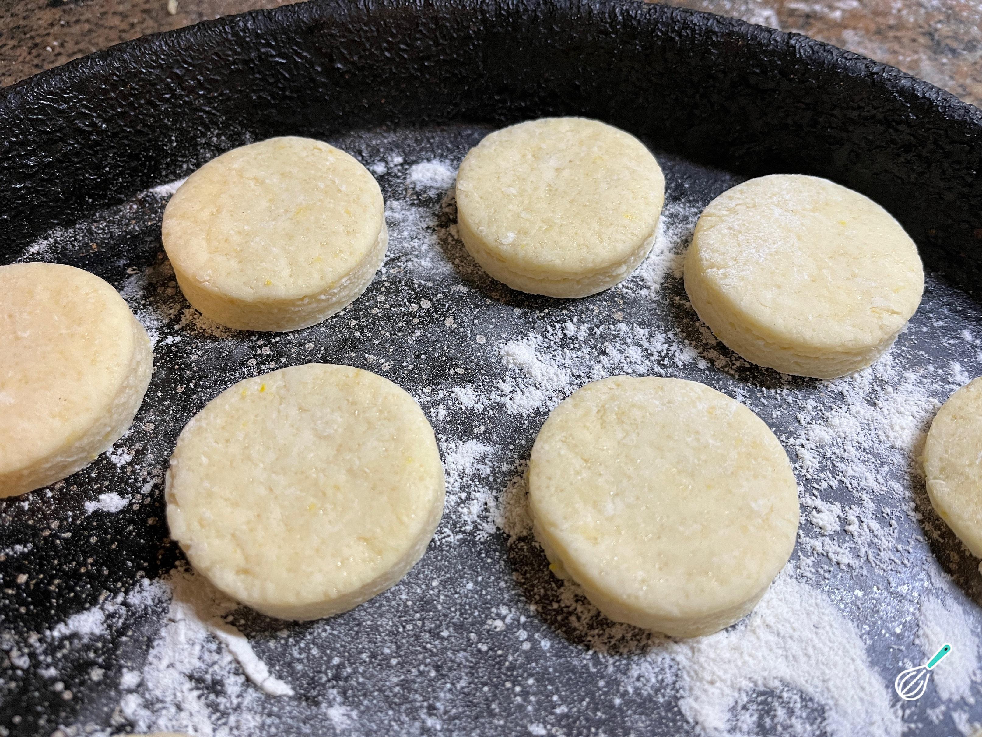Ao cortá-los, arrume cada scon em uma assadeira limpa e enfarinhada. Você pode juntar a massa novamente, cortar e repetir até usar tudo, lembre-se de não amassar. Ligue o forno para preaquecer a 180ºC .