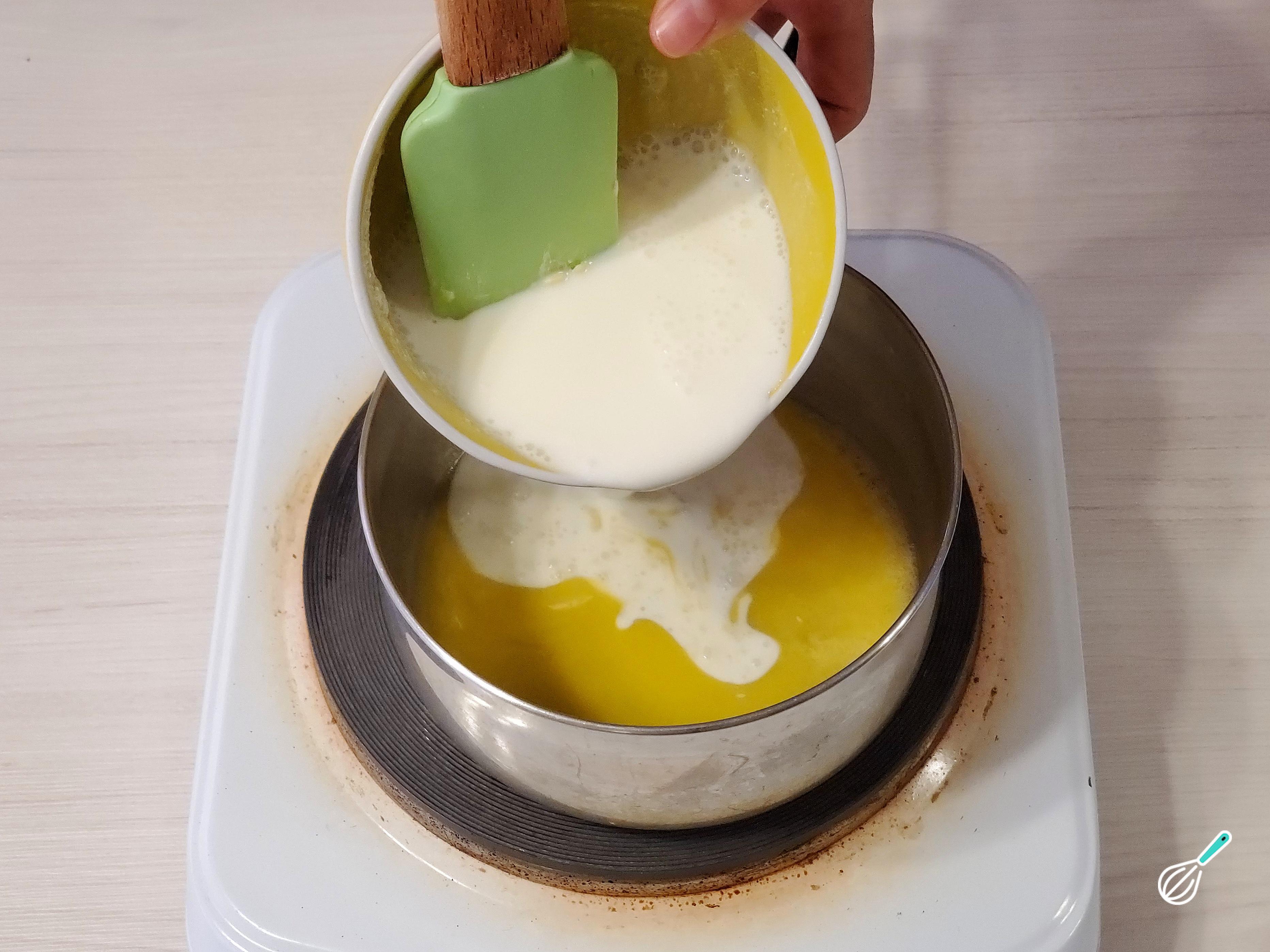 Comece por derreter a manteiga numa panela, faça-o em fogo baixo para que derreta lentamente. Em seguida, despeje imediatamente o leite e aqueça até ficar morno.
