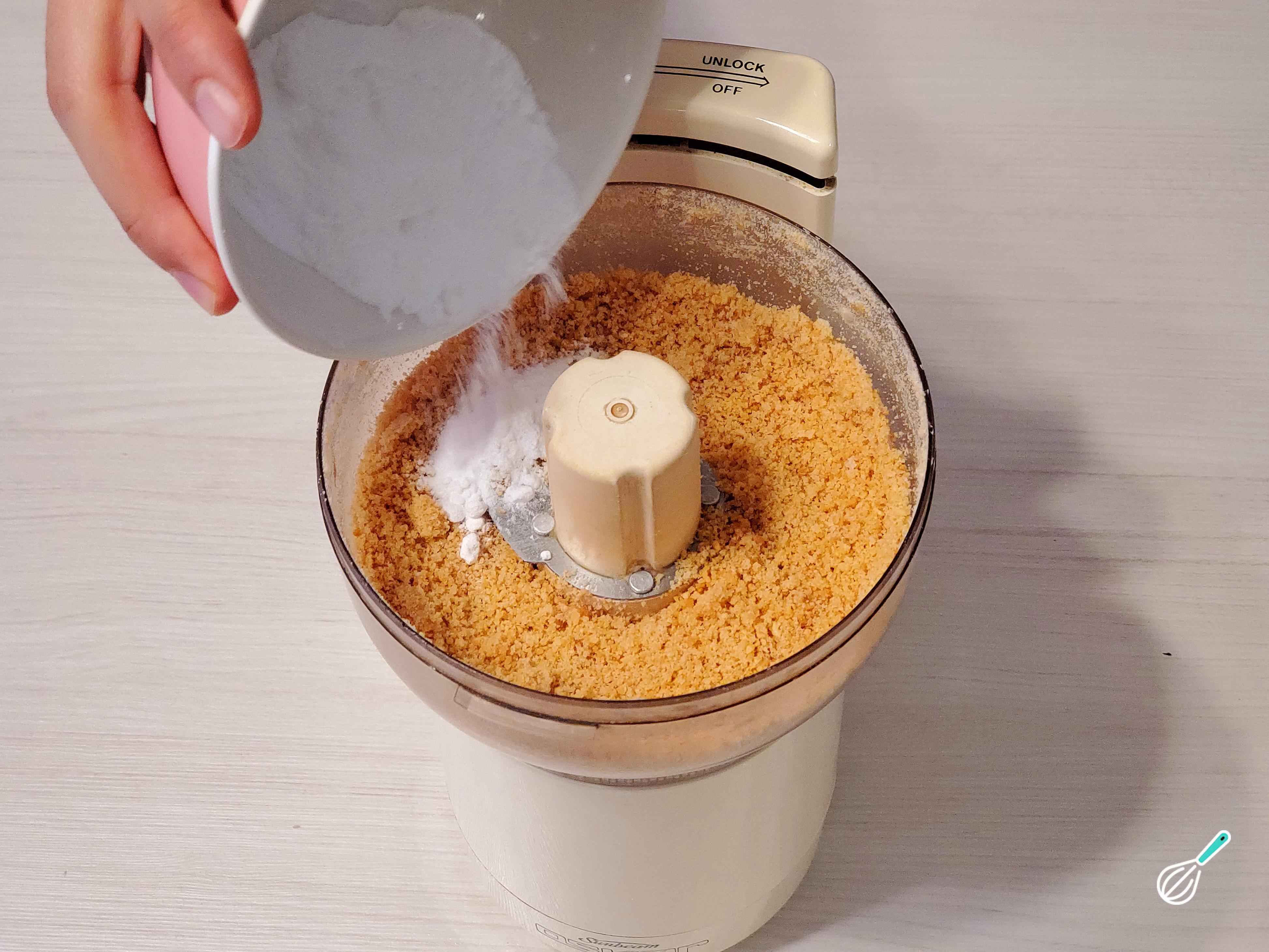 Prepare o creme de amêndoa. Comece por colocar as amêndoas torradas no processador de alimentos e acrescente o açúcar, bata até virar um pó. Se desejar, você pode substituir as amêndoas inteiras por amêndoas em pó para pular esta etapa e, se quiser que o marzipã fique com uma cor creme uniforme, deixe as amêndoas de molho em água quente por alguns minutos. Em seguida, retire a casca e proceda à trituração junto com o açúcar.