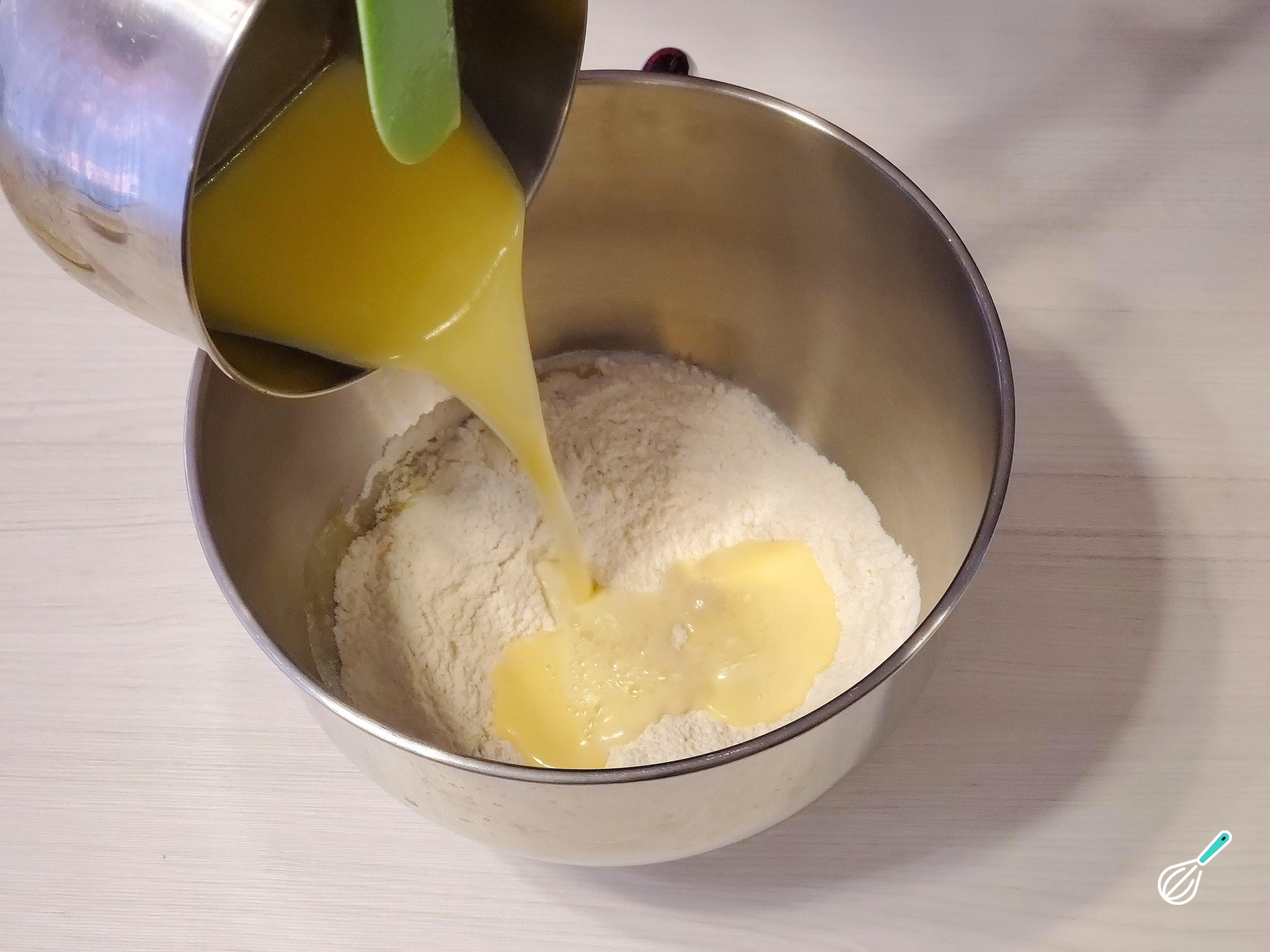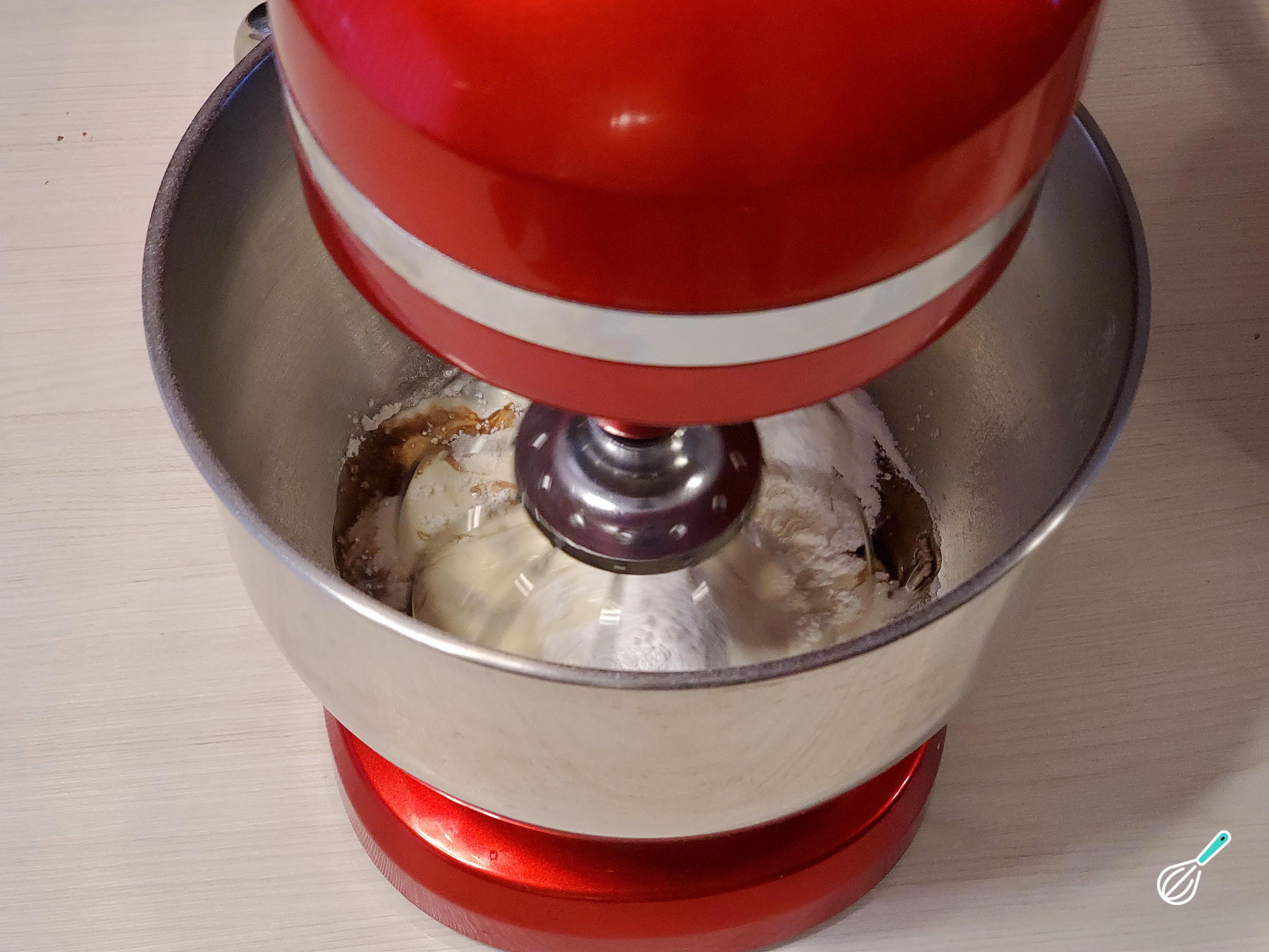 Despeje o leite morno por cima e comece a misturar utilizando o acessório da batedeira.