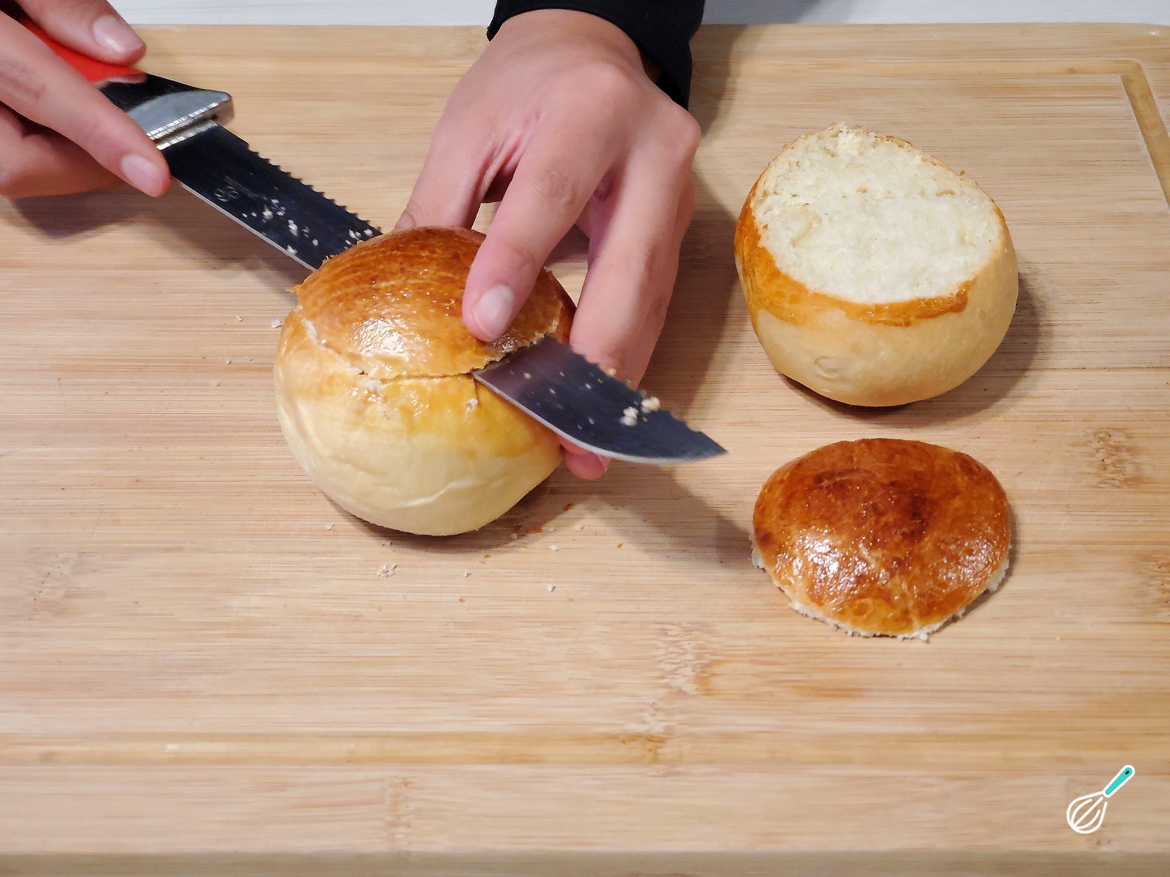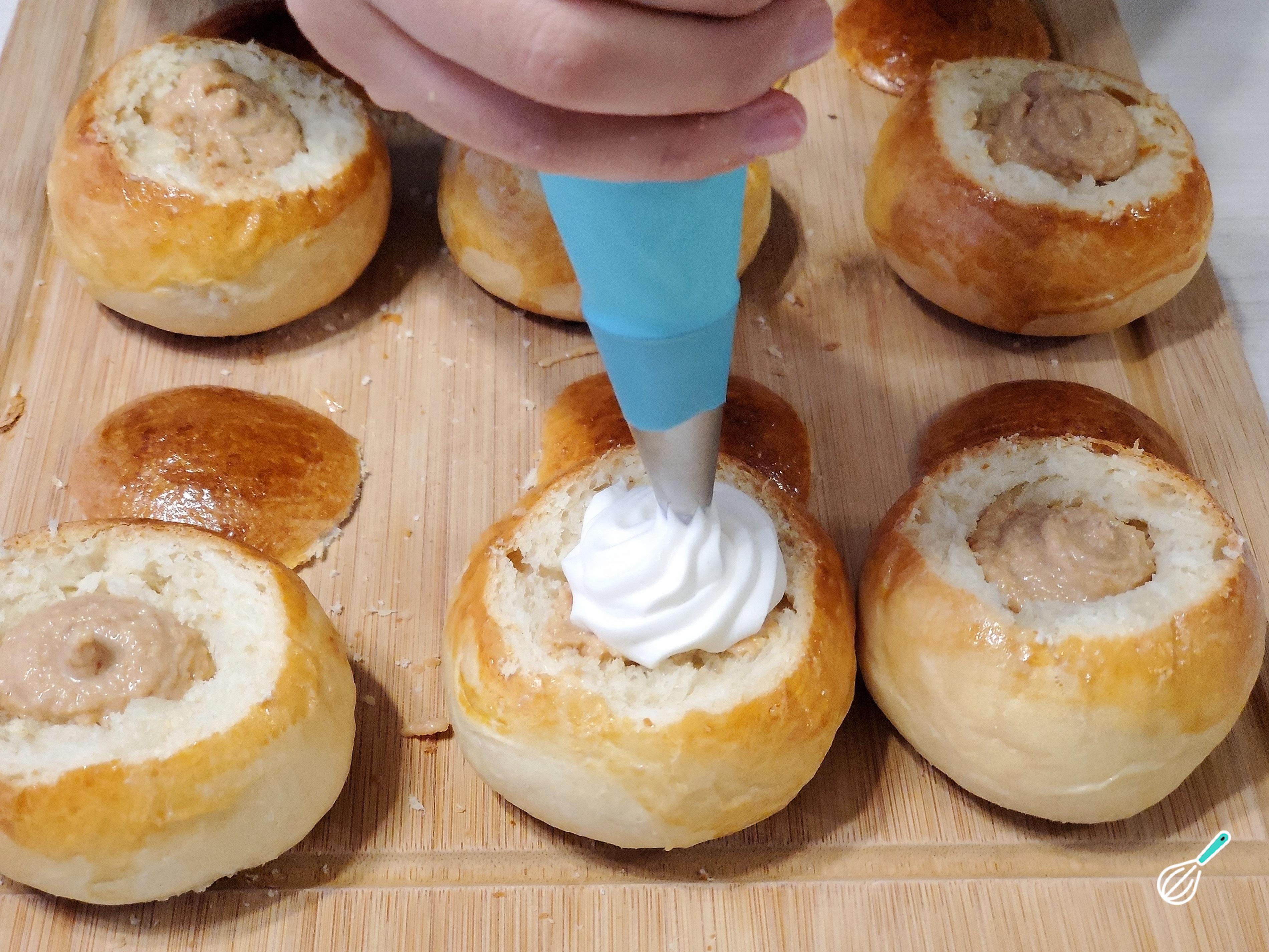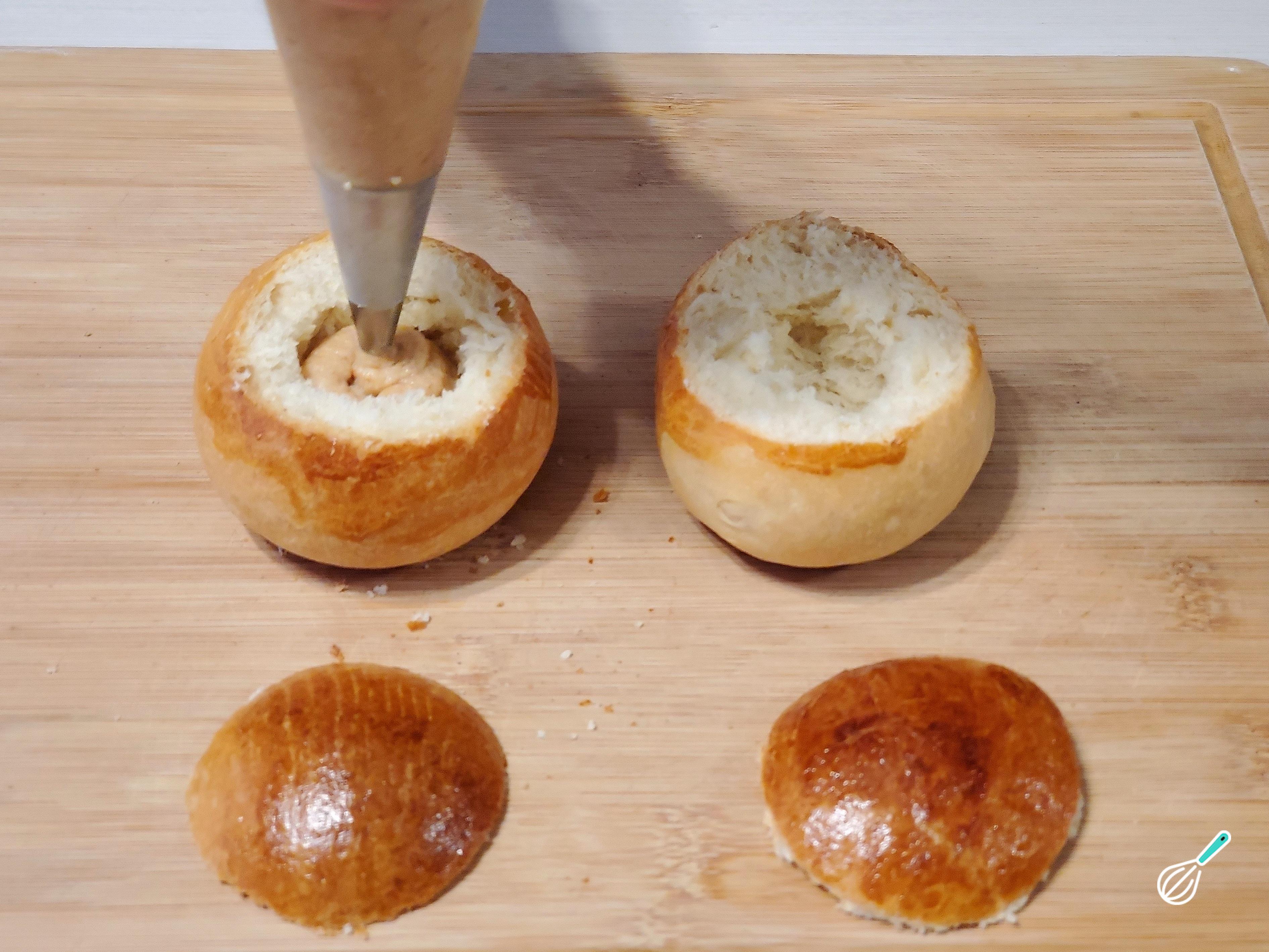Retire um pouco do miolo do pão e despeje ali o creme de amêndoa.