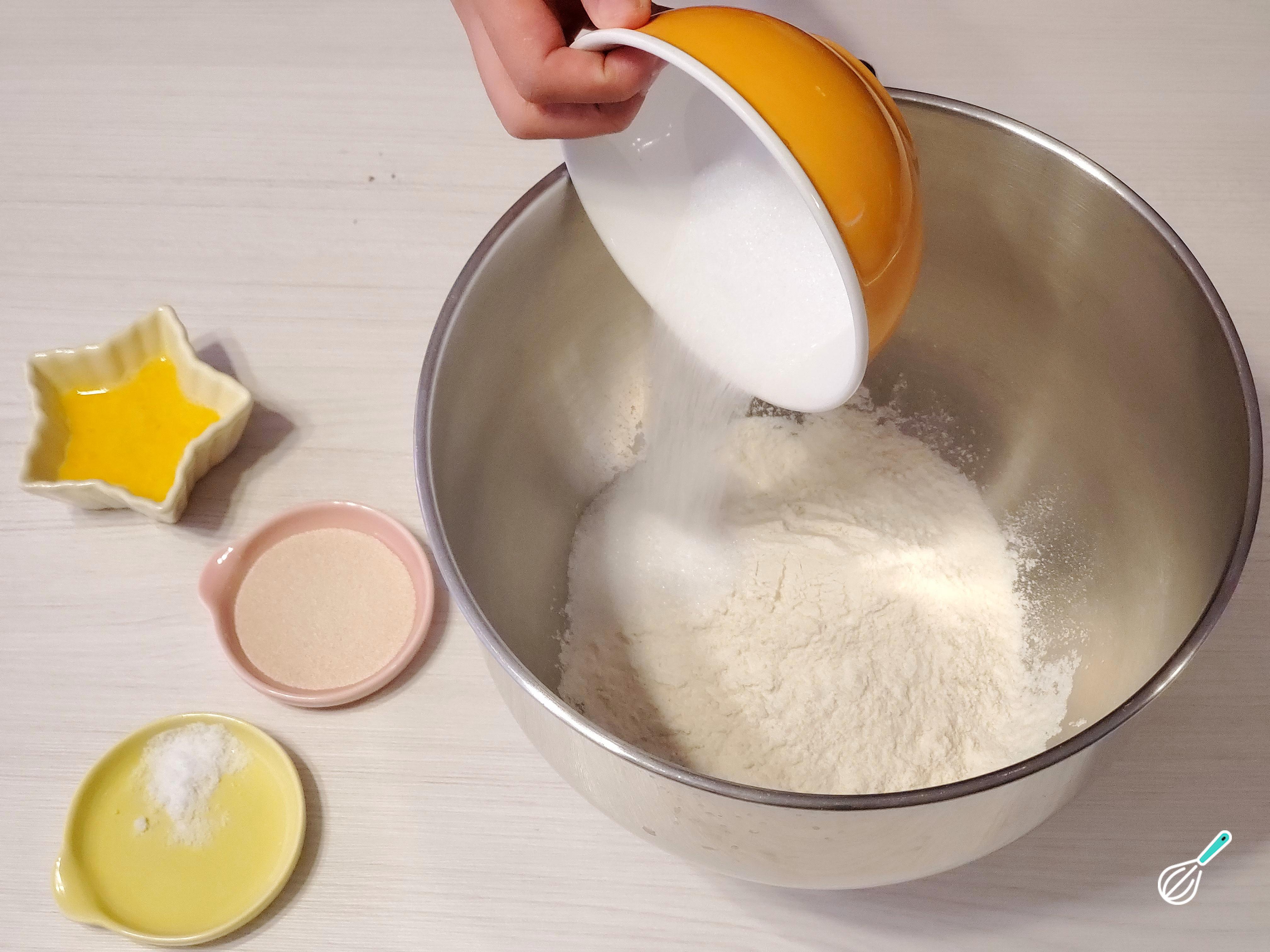 À parte, na tigela da batedeira, despeje a farinha, o sal, o açúcar, o fermento biológico seco, o cardamomo moído ou em pó e o ovo. Misture um pouco.