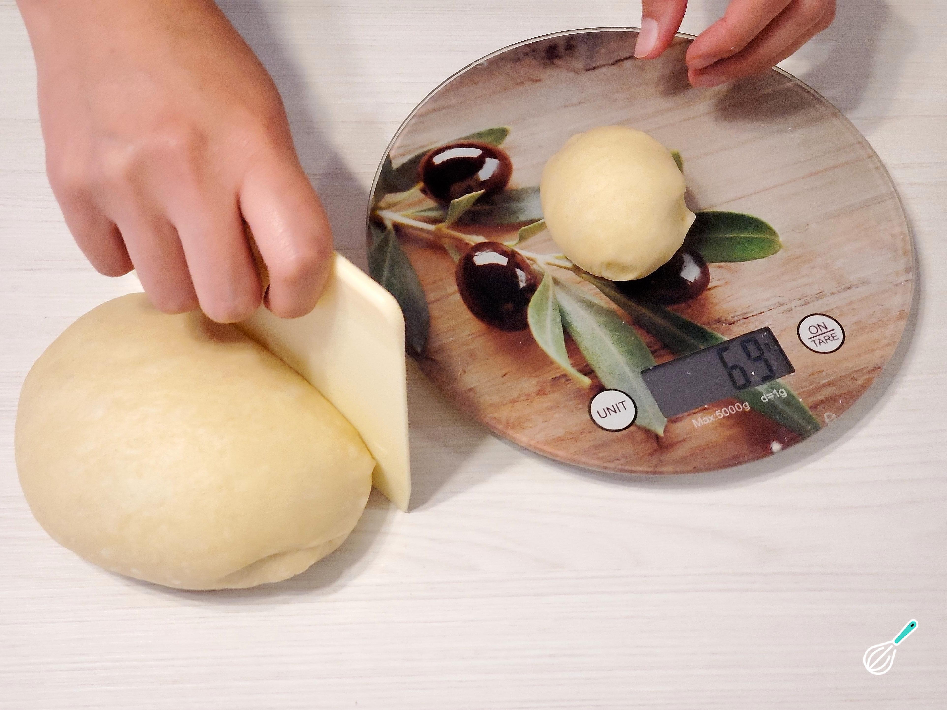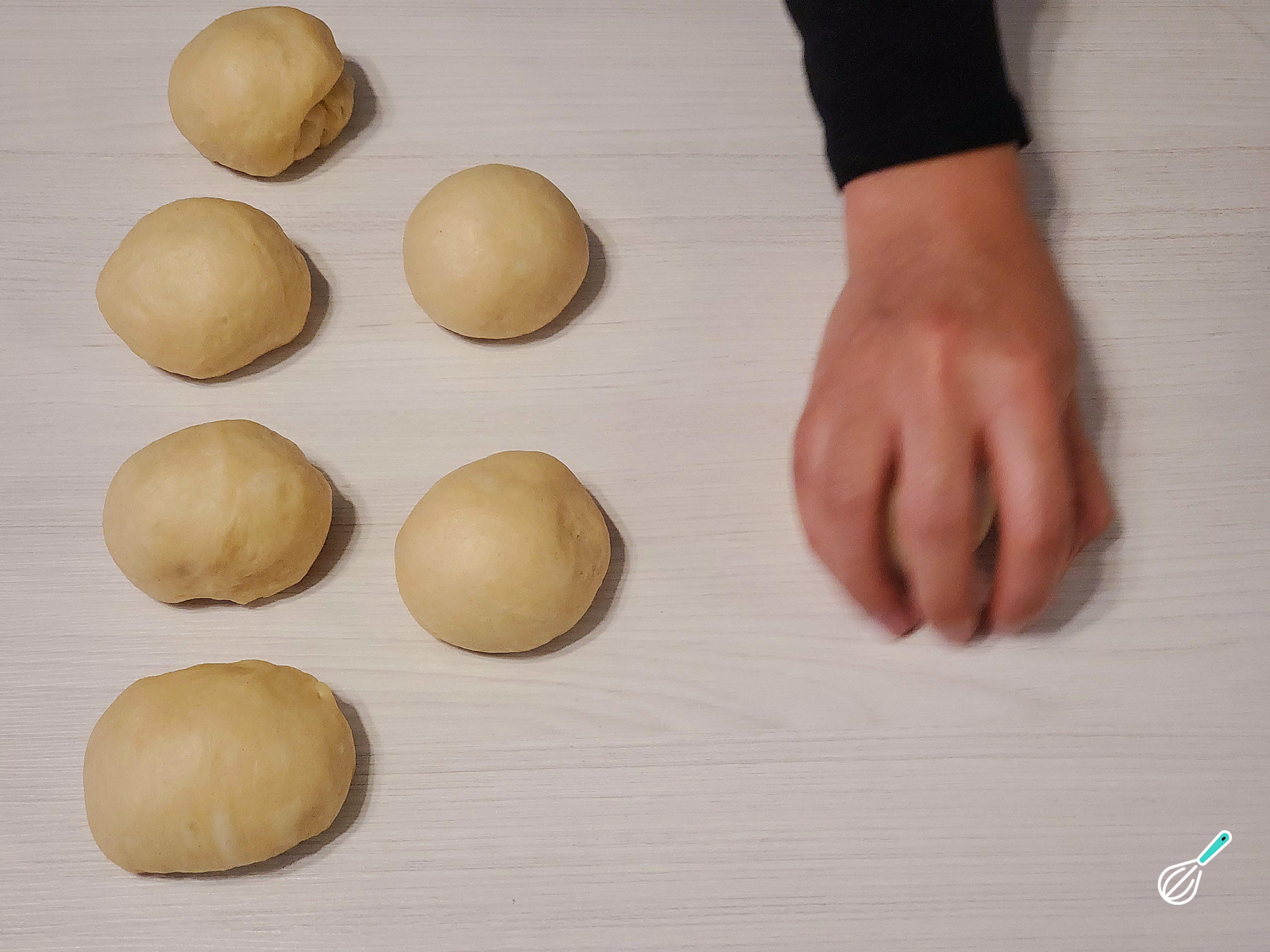 Terminado o tempo de descanso, faça furos com os dedos na massa, enrole novamente e divida em pãezinhos de aproximadamente 70 a 100 gramas.