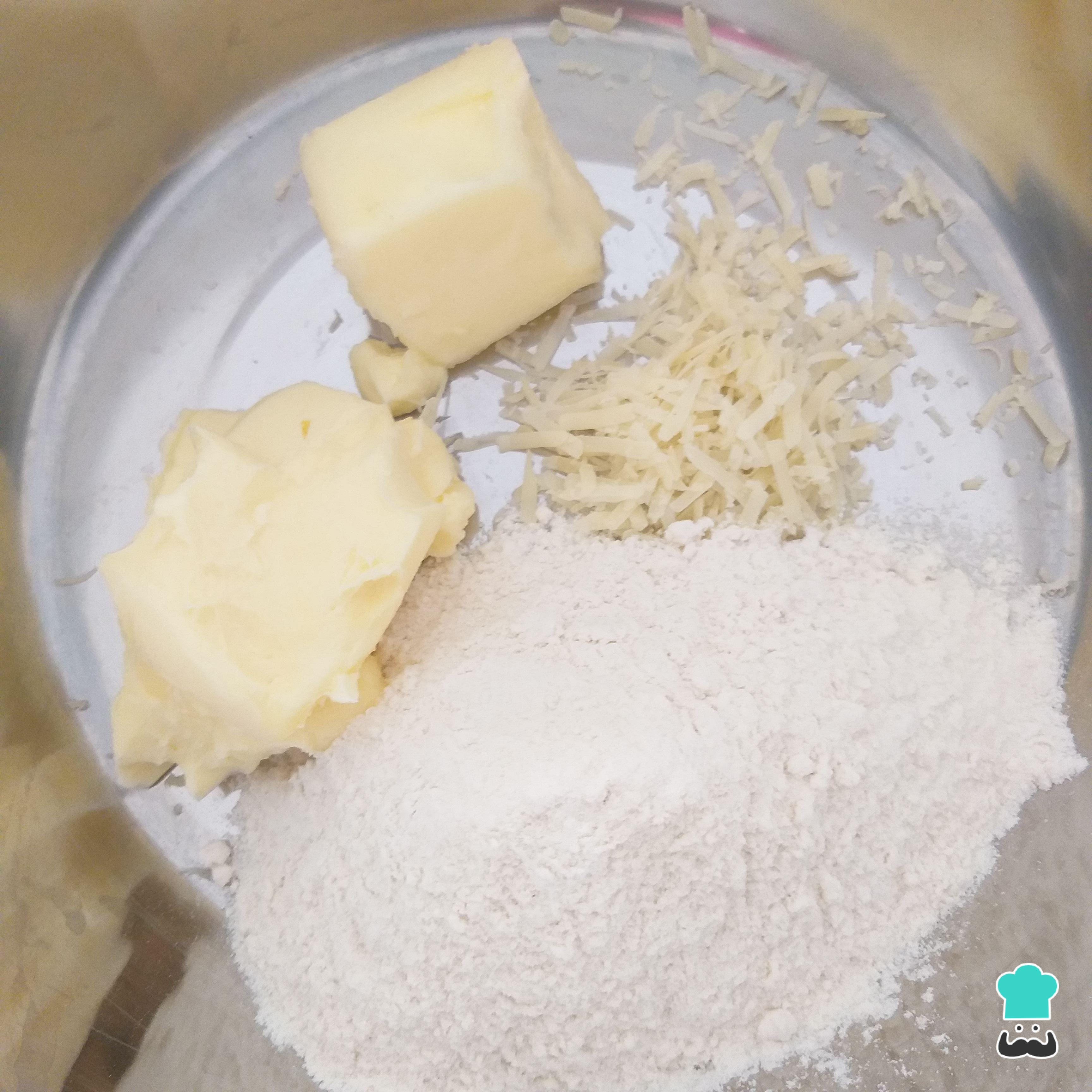 Coloque todos os ingredientes dos sequilhos salgados em uma vasilha: o trigo, a manteiga, o queijo e o sal.