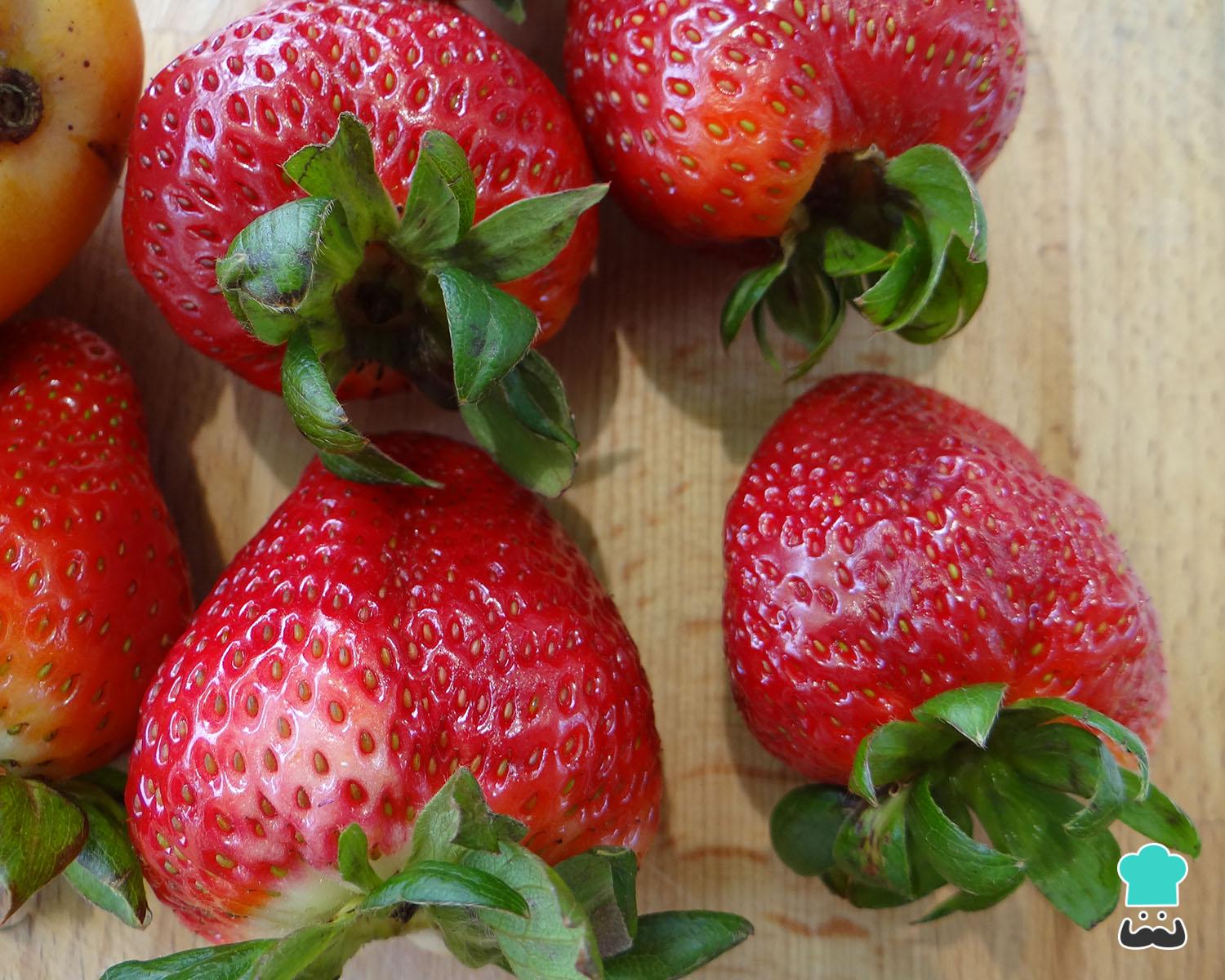 Nesta receita de smoothie de morango e banana comece por tirar as folhas dos morangos e cortá-los em pedacinhos. De seguida descasque a banana e corte em pedacinhos também.