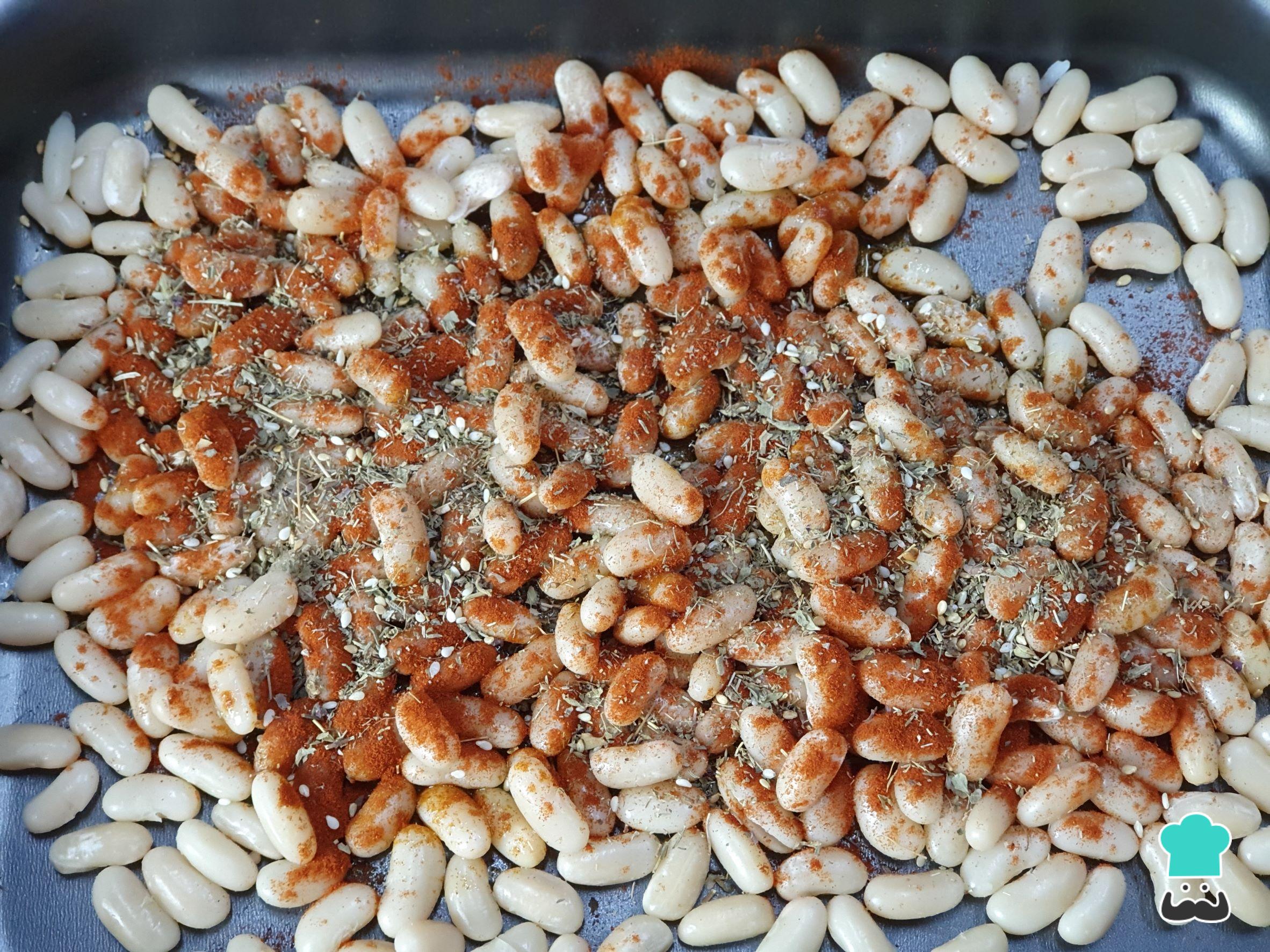 Em uma assadeira acomode os feijões e adicione os temperos e o azeite de oliva. Se quiser você pode preparar seu tempero zaatar caseiro ou usar outros temperinhos da sua preferência!