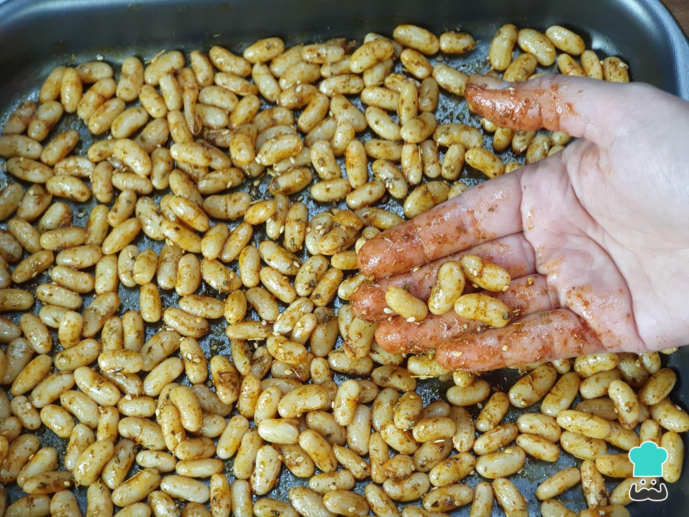Misture muito bem, de preferência com as mãos, para se certificar que todos os feijões estarão bem besuntados com azeite e que o tempero ficou em todos os grãos. Leve para assar por aproximadamente 8 a 10 minutos, mexendo de vez em quando.