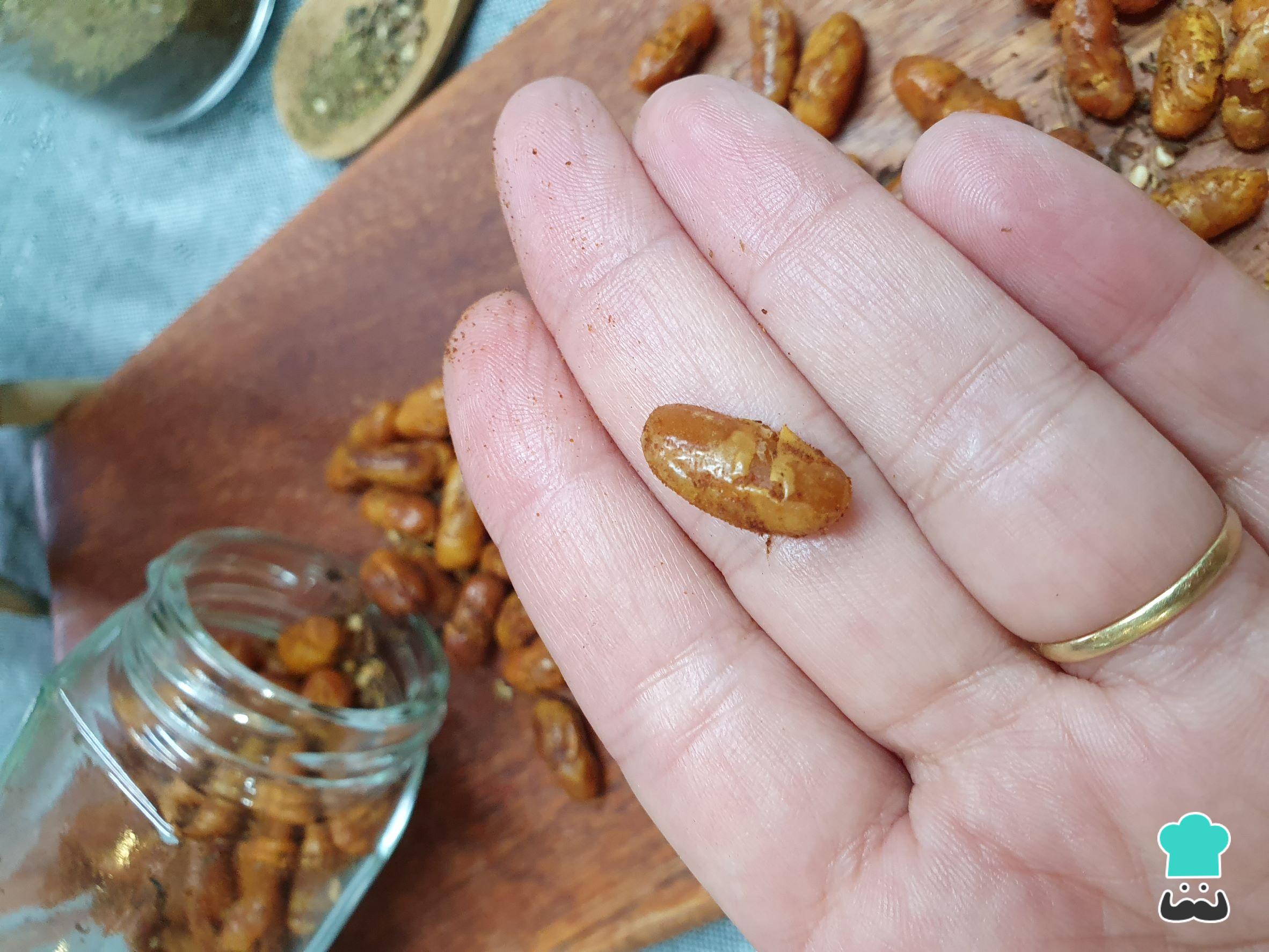 Os grãos não podem assar muito, para não ficarem duros. O ponto ideal é levemente dourado, sequinho e levemente firme. Depois que ele esfriar, esse salgadinho de feijão irá ficar crocante.