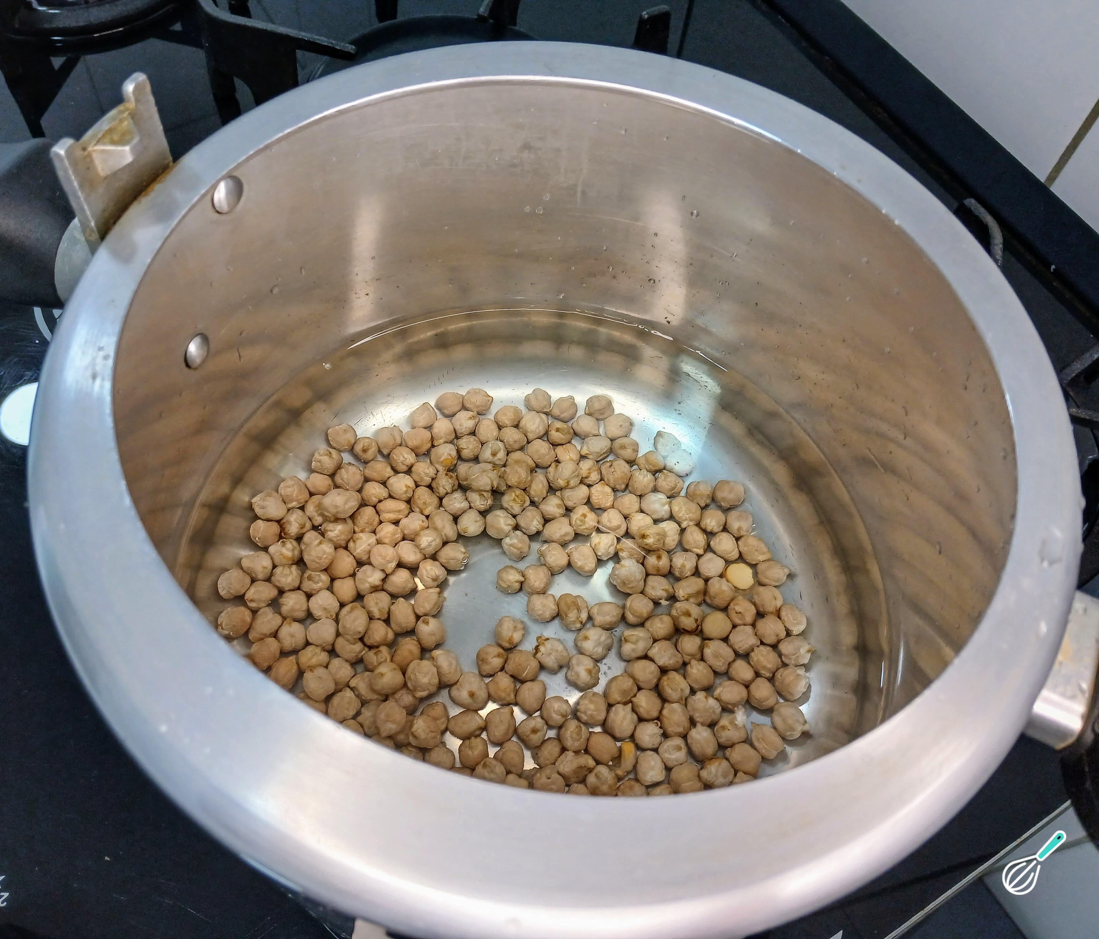 Comece cozinhando o grão de bico na panela de pressão. Coloque o grão de bico, cubra com água e acrescente sal. Tampe a panela e assim que pegar pressão, marque 15 minutos. Depois desse tempo, desligue o fogo e deixe o ar sair naturalmente . Retire o grão de bico da panela e passe por uma peneira para escorrer a água.