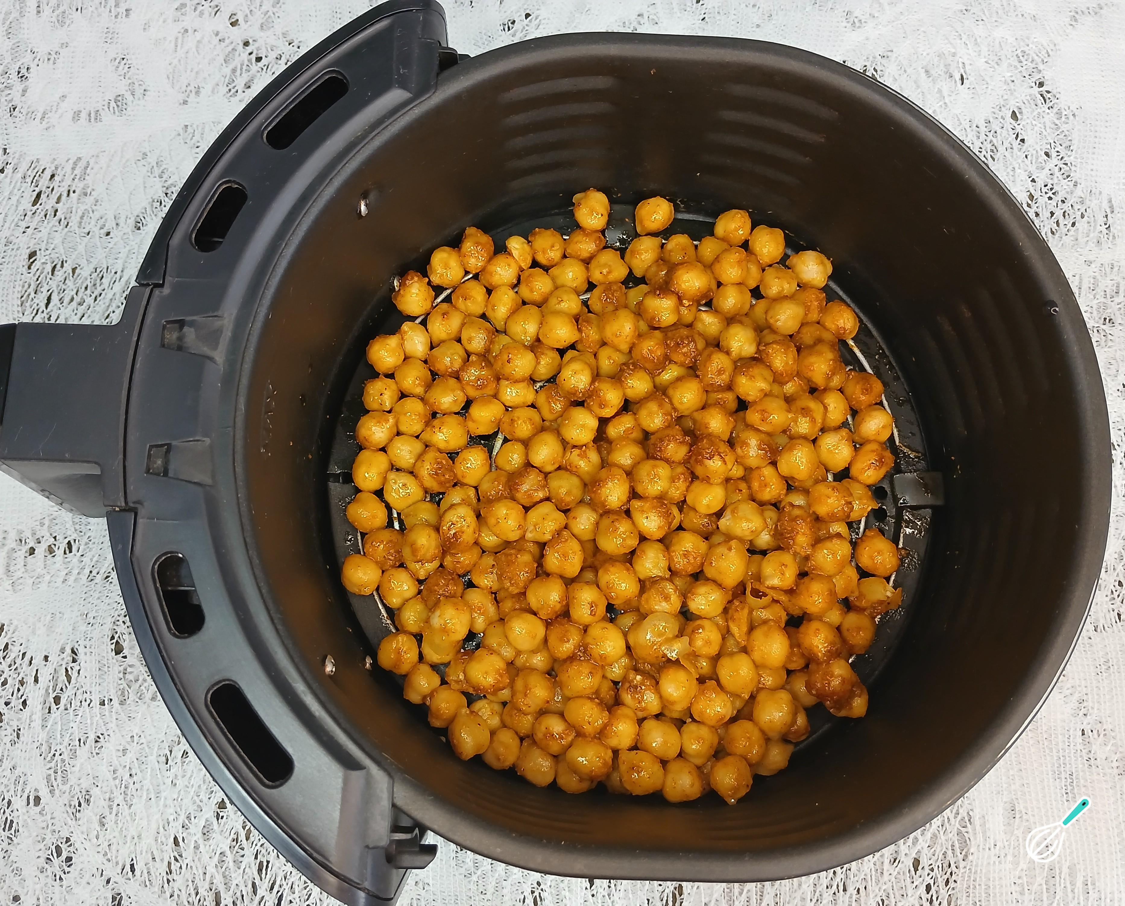 Depois de temperar o grão de bico, coloque-o na panela da air fryer e leve para assar por aproximadamente 20 minutos a 180 graus. Abra a panela por algumas vezes e mexa o grãos para assarem por igual.