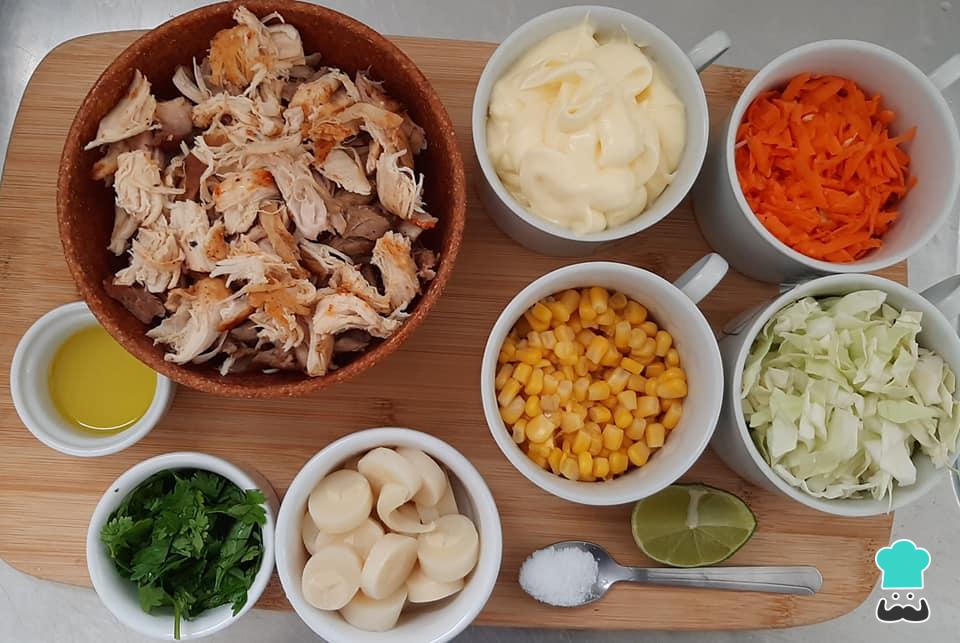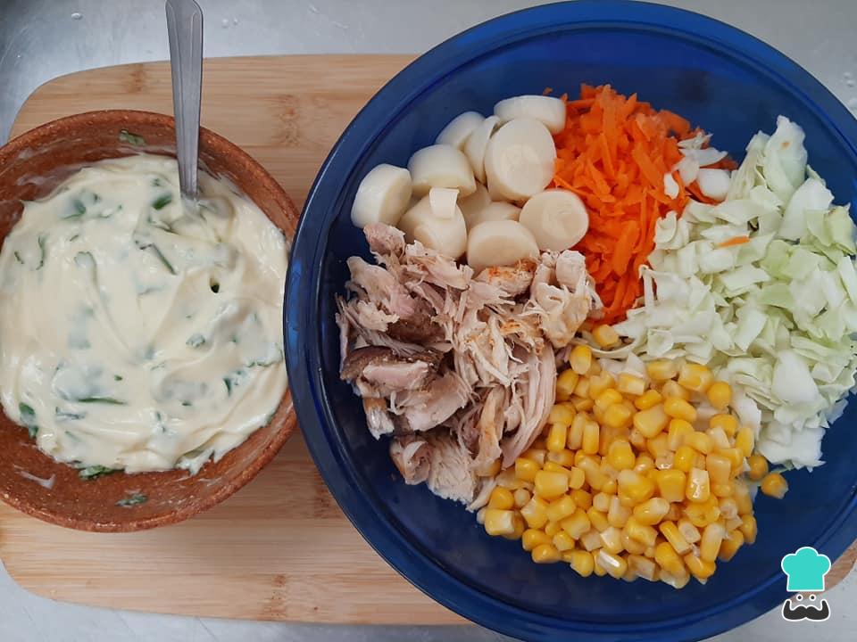 Numa tigela grande junte as sobras de frango desfiadas, a cenoura ralada, o repolho picado ou em tirinhas finas, o milho verde drenado e o palmito picado.