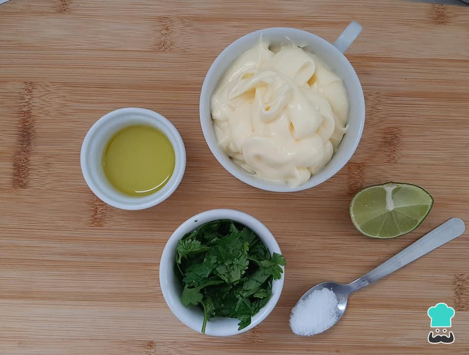 Prepare a maionese temperada simplesmente misturando-a com sal, gotas de limão e coentro a gosto.