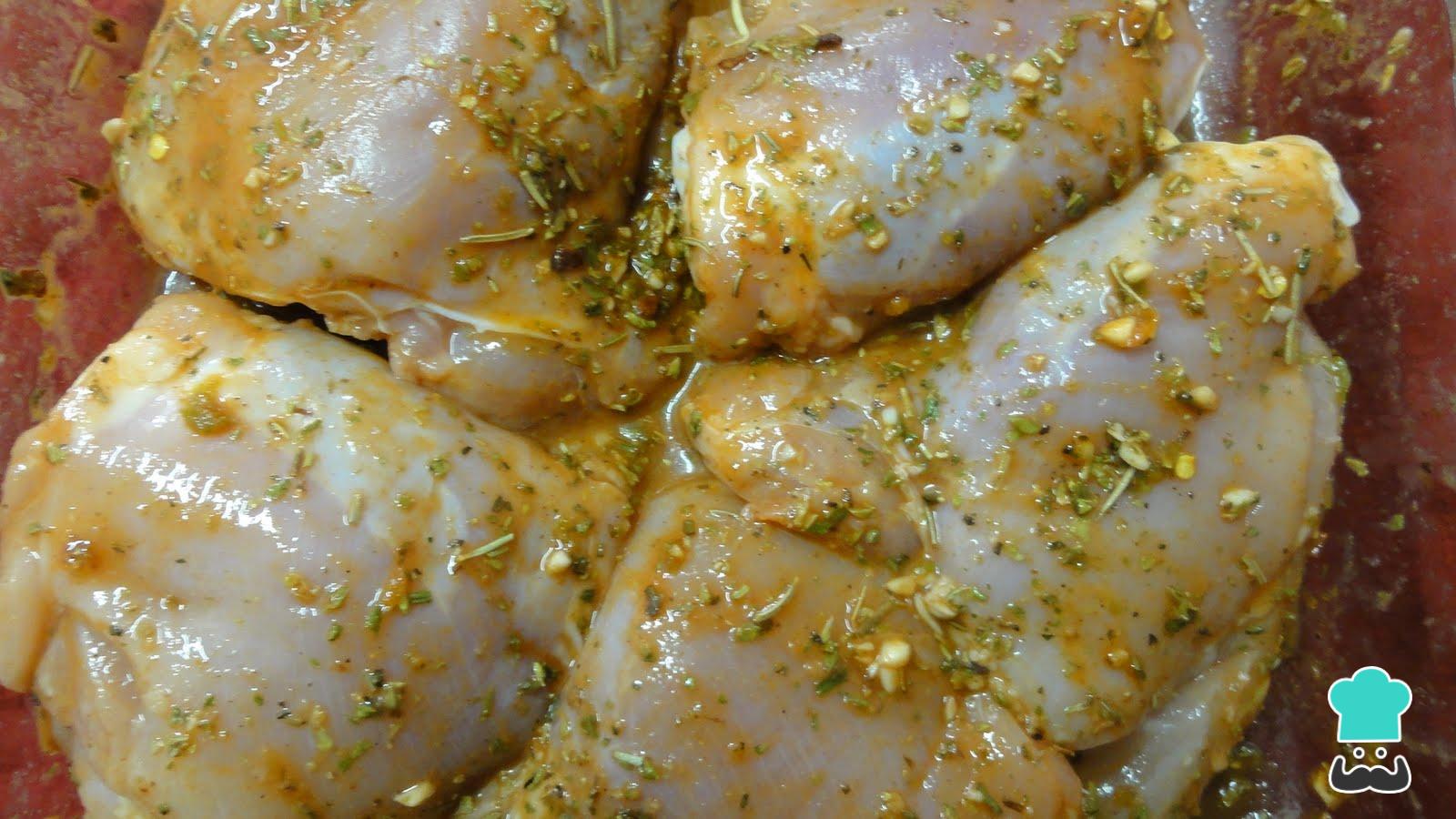 Para fazer esta receita de sobrecoxa de frango comece por temperar a carne com o suco do limão, pimenta, oréganos e creme de cebola. Envolva bem e reserve por 20 minutos na geladeira, para tomar o gosto.