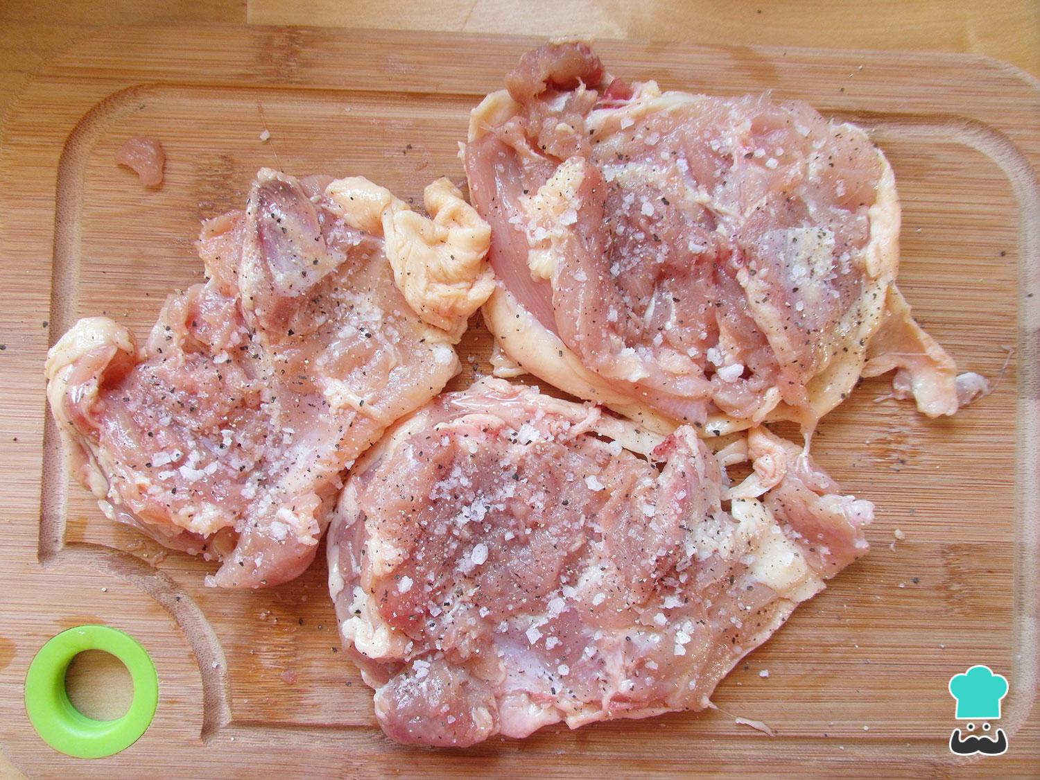 Para fazer essa receita de sobrecoxa comece por desossar a carne. Para isso faça um corte na carne ao longo do osso e, depois, raspe com a faca para separar do osso. Corte também fora a cartilagem, que estará numa das pontas do osso, e o excesso de gordura. Mantenha a pele e tempere a gosto com sal e pimenta.