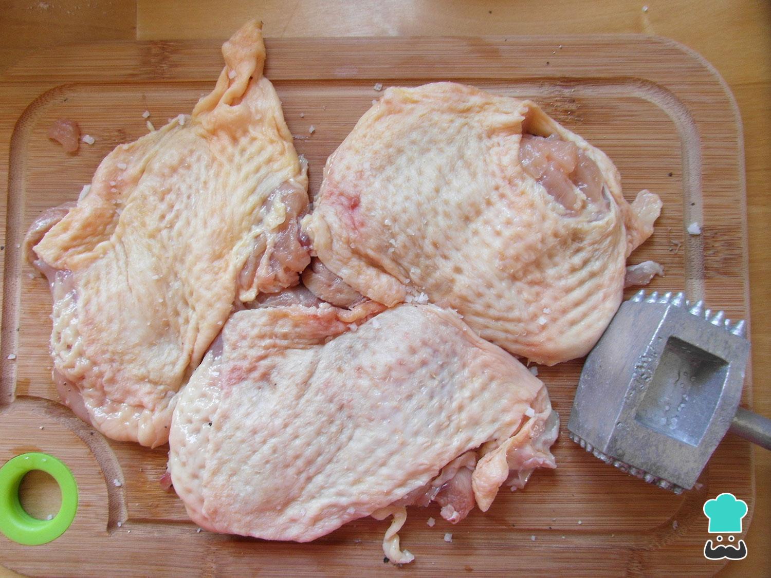 Em seguida bata na carne com um martelo de cozinha. Fazemos isso para que a sobrecoxa fique mais compacta e toda com a mesma espessura, demorando assim menos tempo para cozinhar.