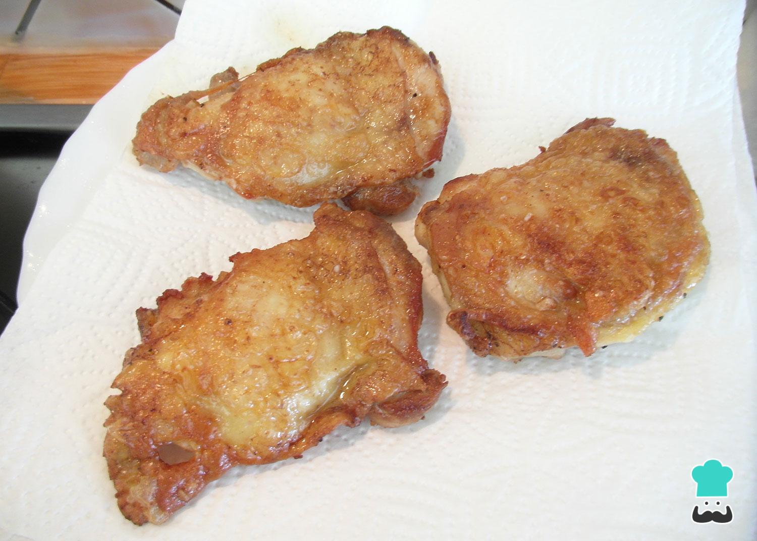 Desligue o fogo quando quando a pele da sobrecoxa estiver bem crocante e a carne estiver douradinha. Retire para um prato com papel absorvente e deixe escorrer o excesso de óleo por 1-2 minutos.