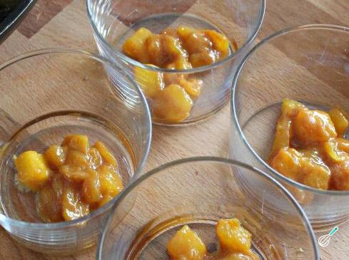 Faça a montagem da sobremesa: em 4 copinhos coloque um pouco de polpa de manga e cubra com 2 colheres de sopa do creme preparado no passo anterior. Coloque mais um pouco de manga e cubra com mais uma porção do creme.