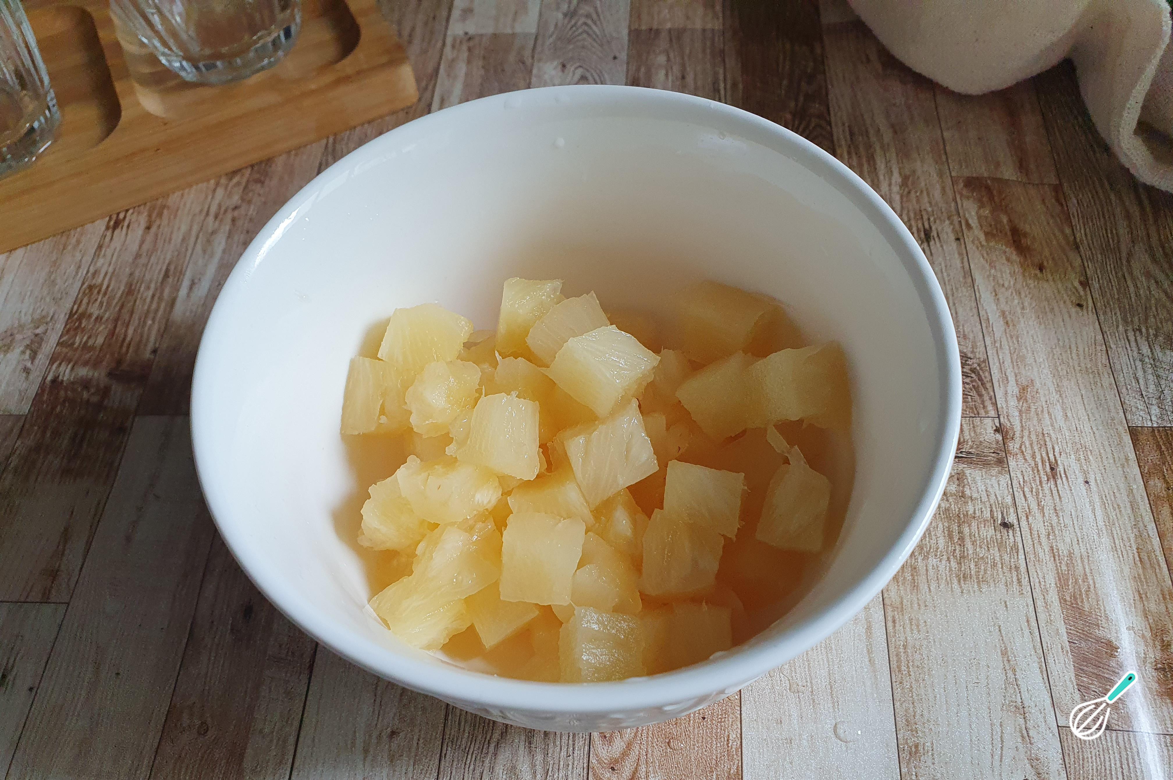 Comece partindo os abacaxis em cubinhos pequenos. Reserve.