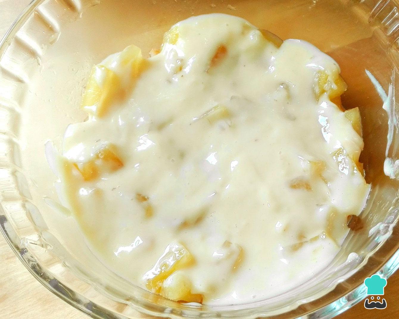 Para fazer esta incrível sobremesa de ananás comece por dissolver o pudim no leite. Adicione metade da calda de uma lata de ananás, misture e reserve na geladeira por 10-15 minutos, para espessar (não precisa ir no fogo antes).