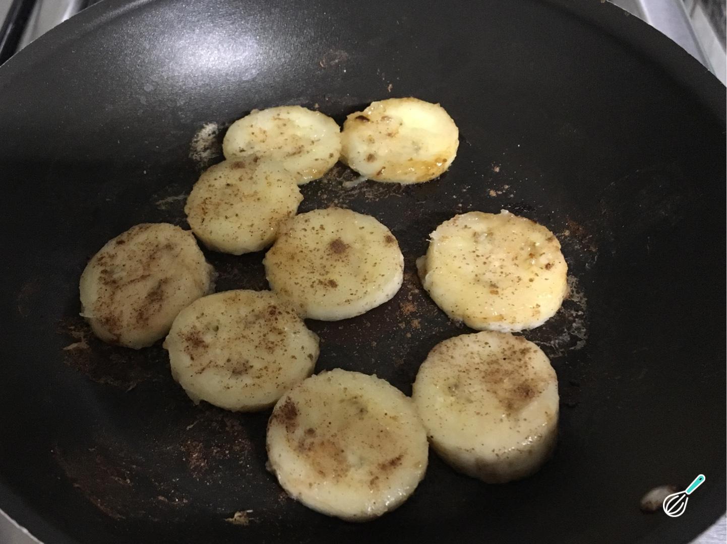 Em uma frigideira pincele óleo de coco e coloque a banana cortada em fatias. Polvilhe um pouco de canela, deixe a banana dourar ligeiramente dos dois lados e desligue.