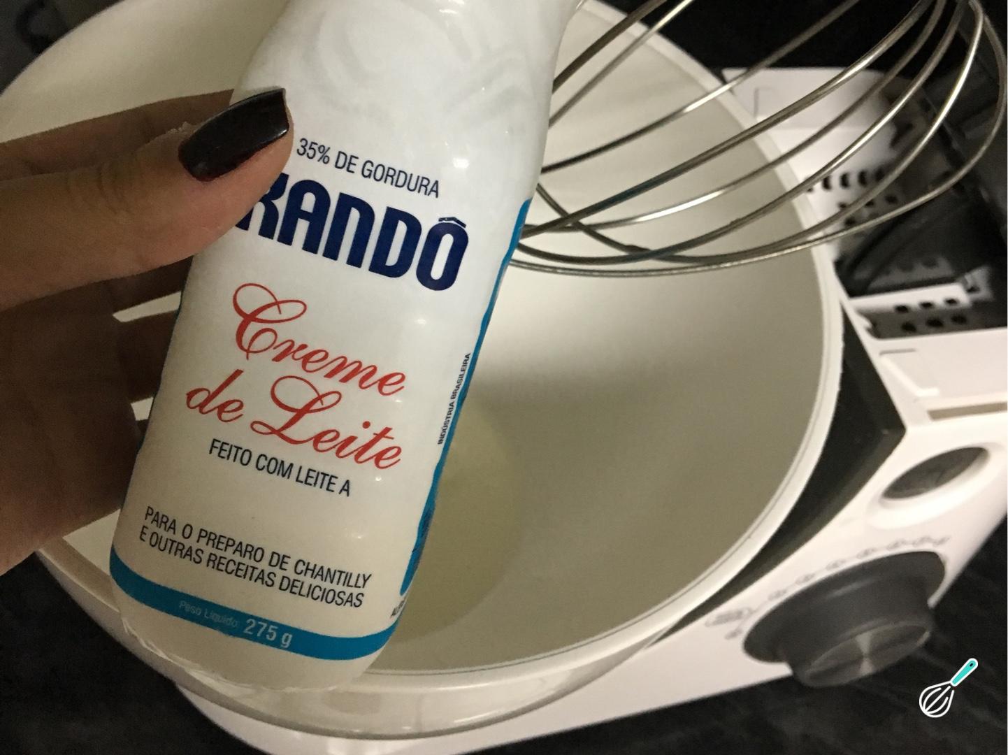 Para fazer o chantilly fit pegue o creme de leite e bata na batedeira até ficar consistente.