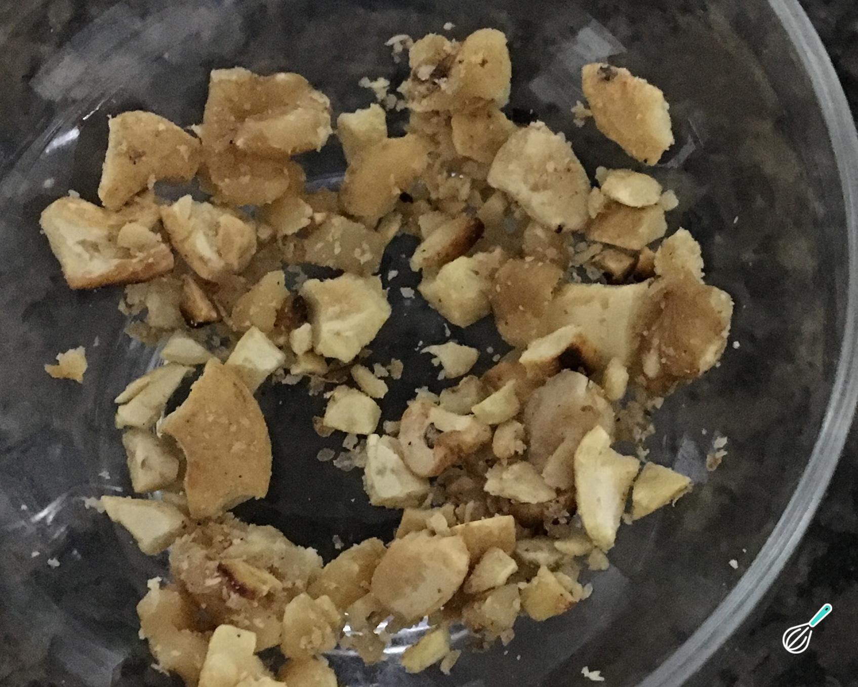 Por fim prepare uma farofa crocante para esta sobremesa saudável: misture as castanhas com o açúcar de coco e coloque metade no fundo de uma tacinha junto com metade da banana também.