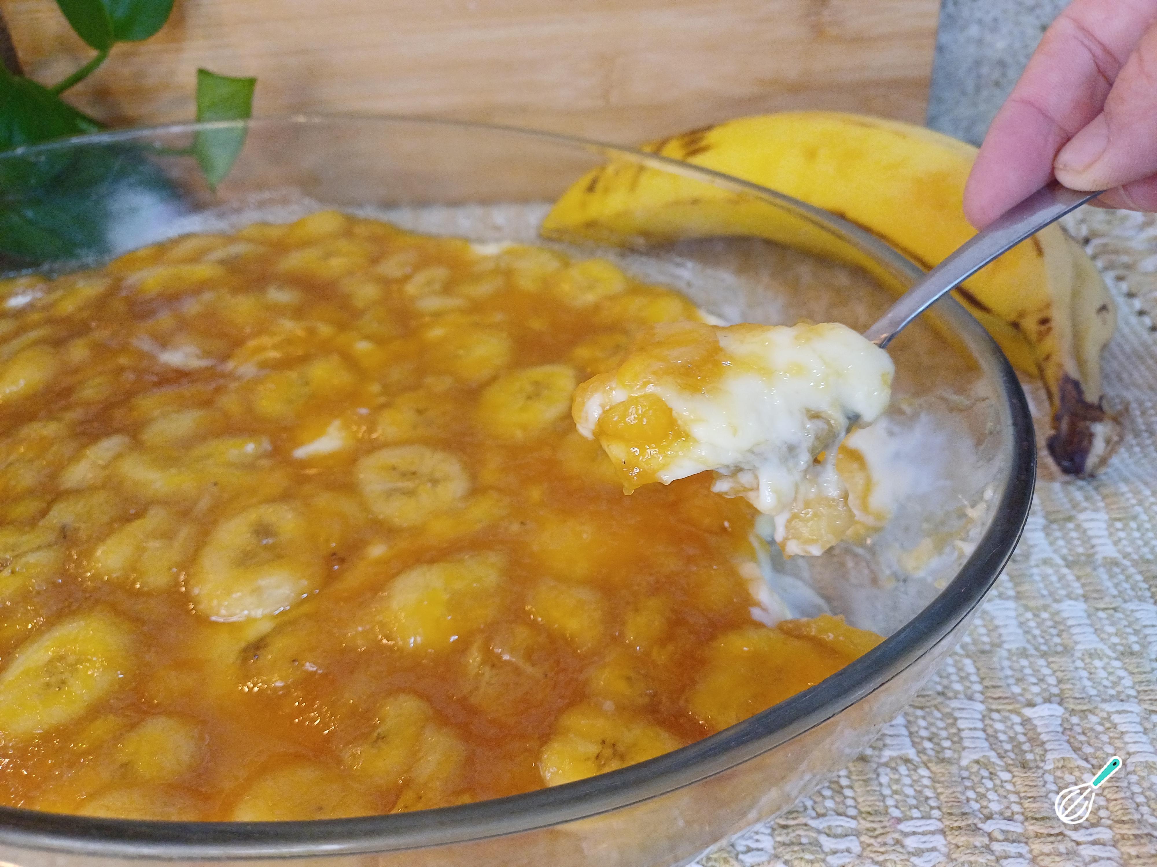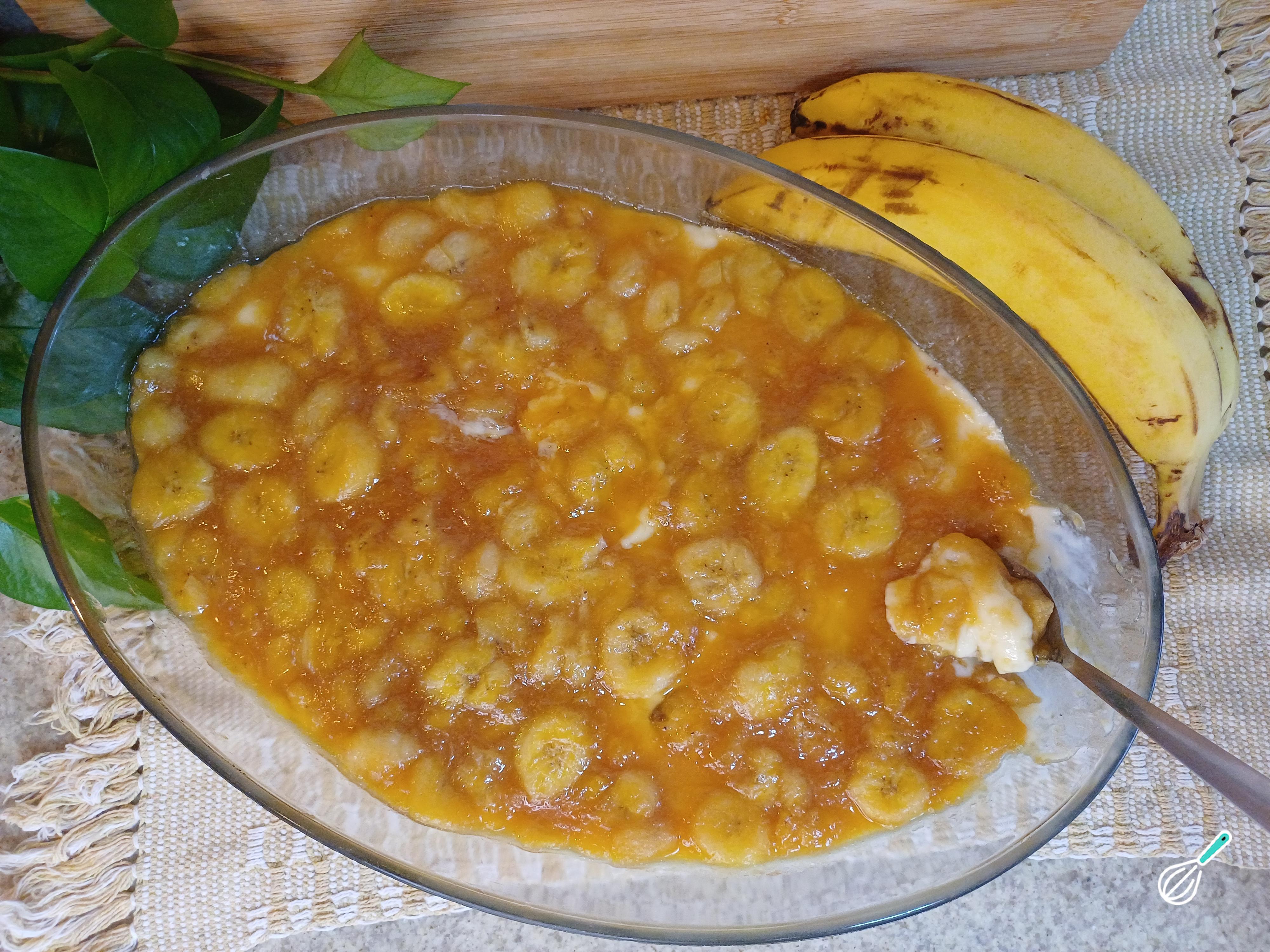 Dica: Cubra a travessa com plástico filme para não endurecer o doce de bananas.