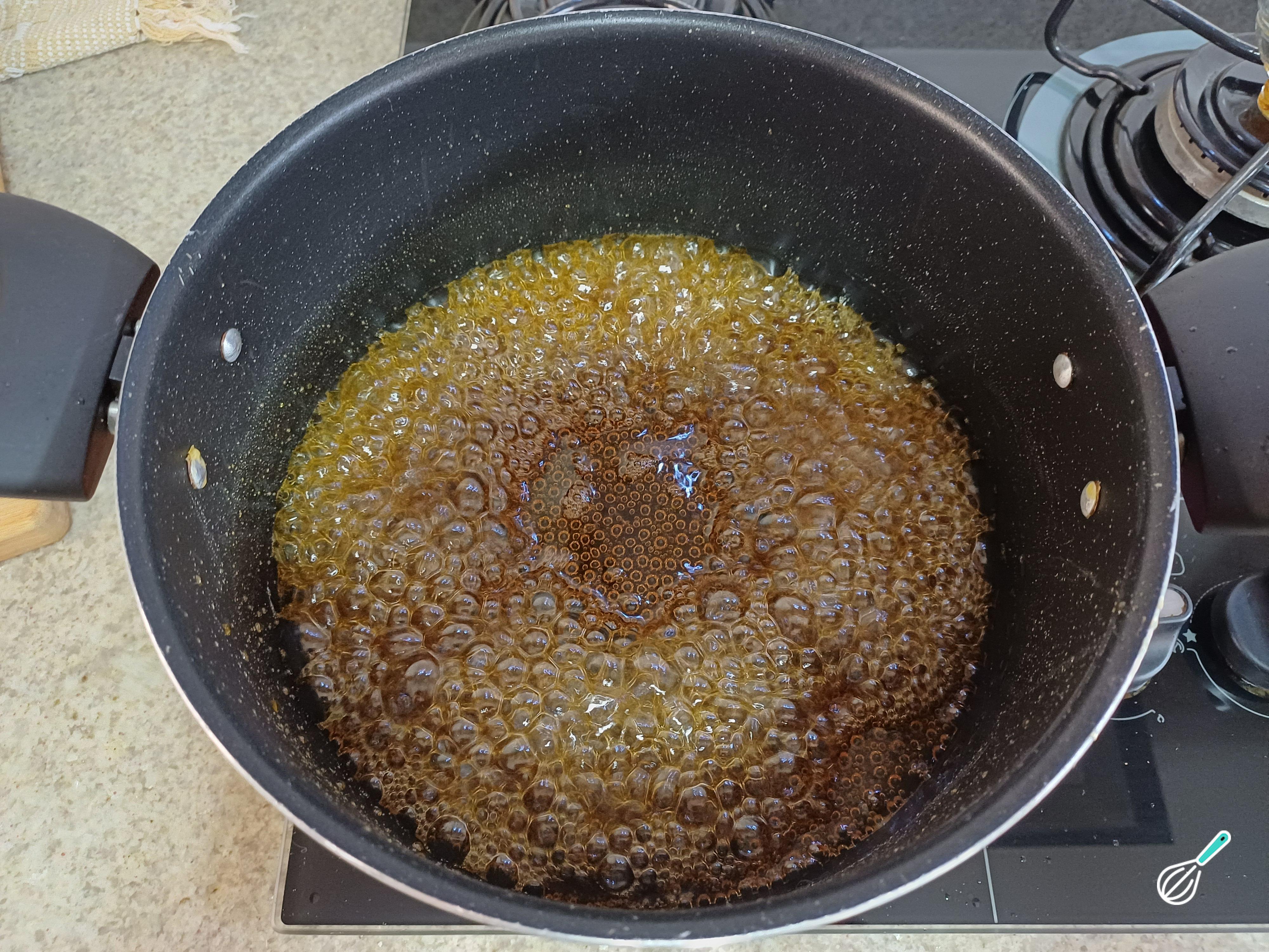Em uma panela média acrescente o açúcar em fogo baixo, até começar a formar o caramelo. Acrescente a água aos poucos e vá mexendo, com uma colher de pau, até dissolver completamente.