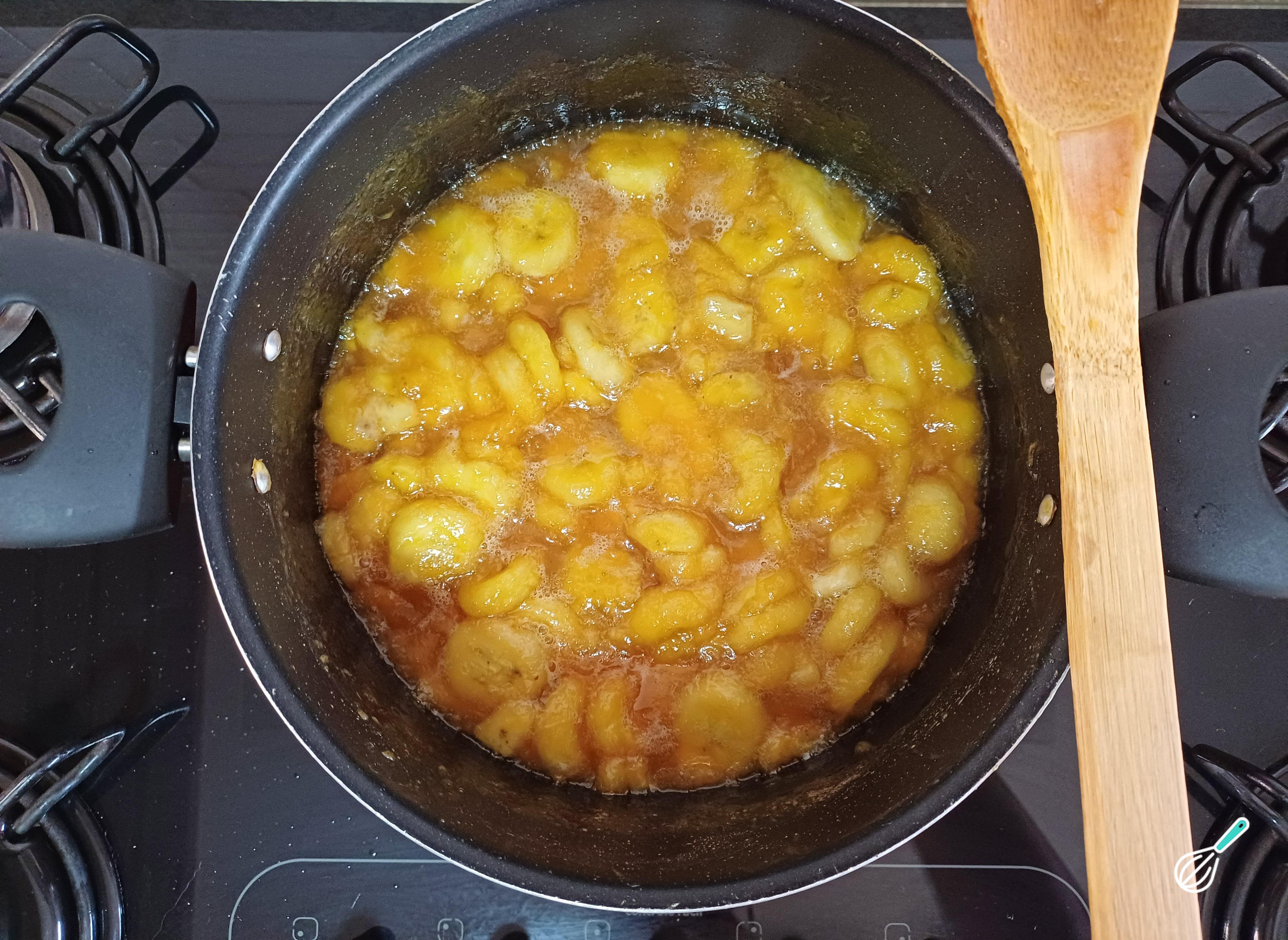 Acrescente as bananas em rodelas e cozinhe até dourar, tomando cuidado para não desmanchar as bananas. Desligue o fogo e reserve.