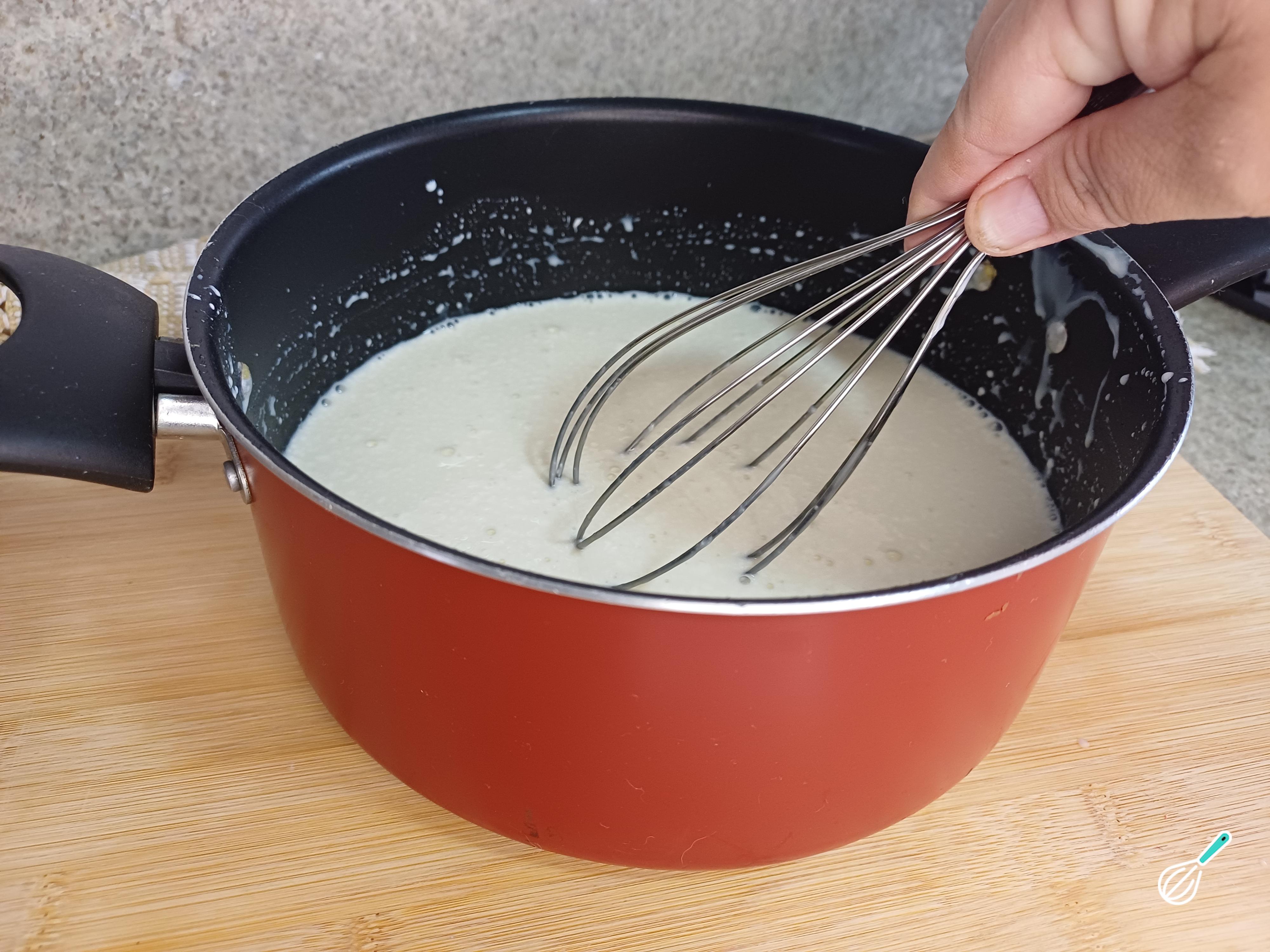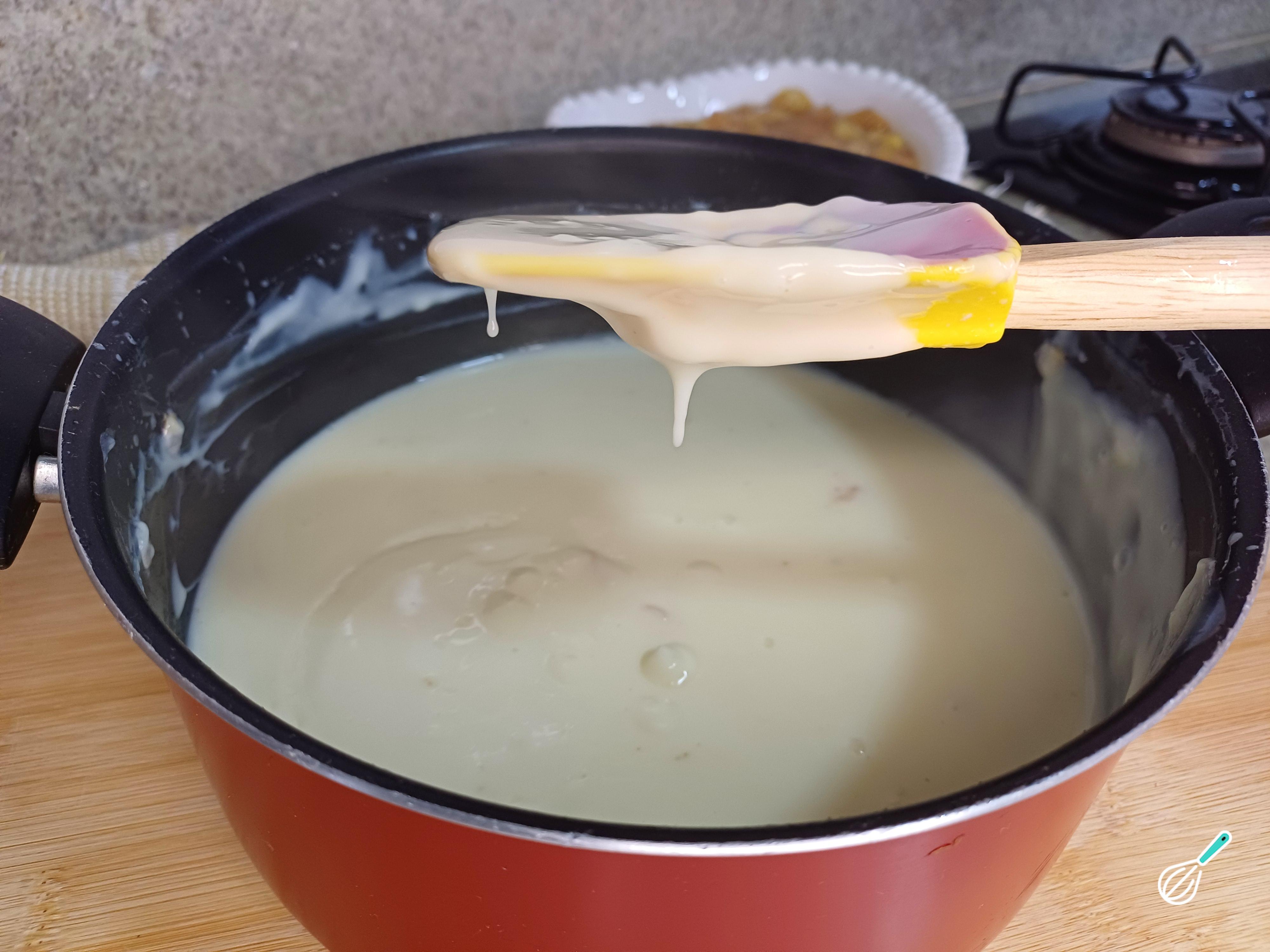 Leve à panela ao fogo baixo, mexendo sempre com uma espátula, até começar a engrossar e formar um creme liso e homogêneo.