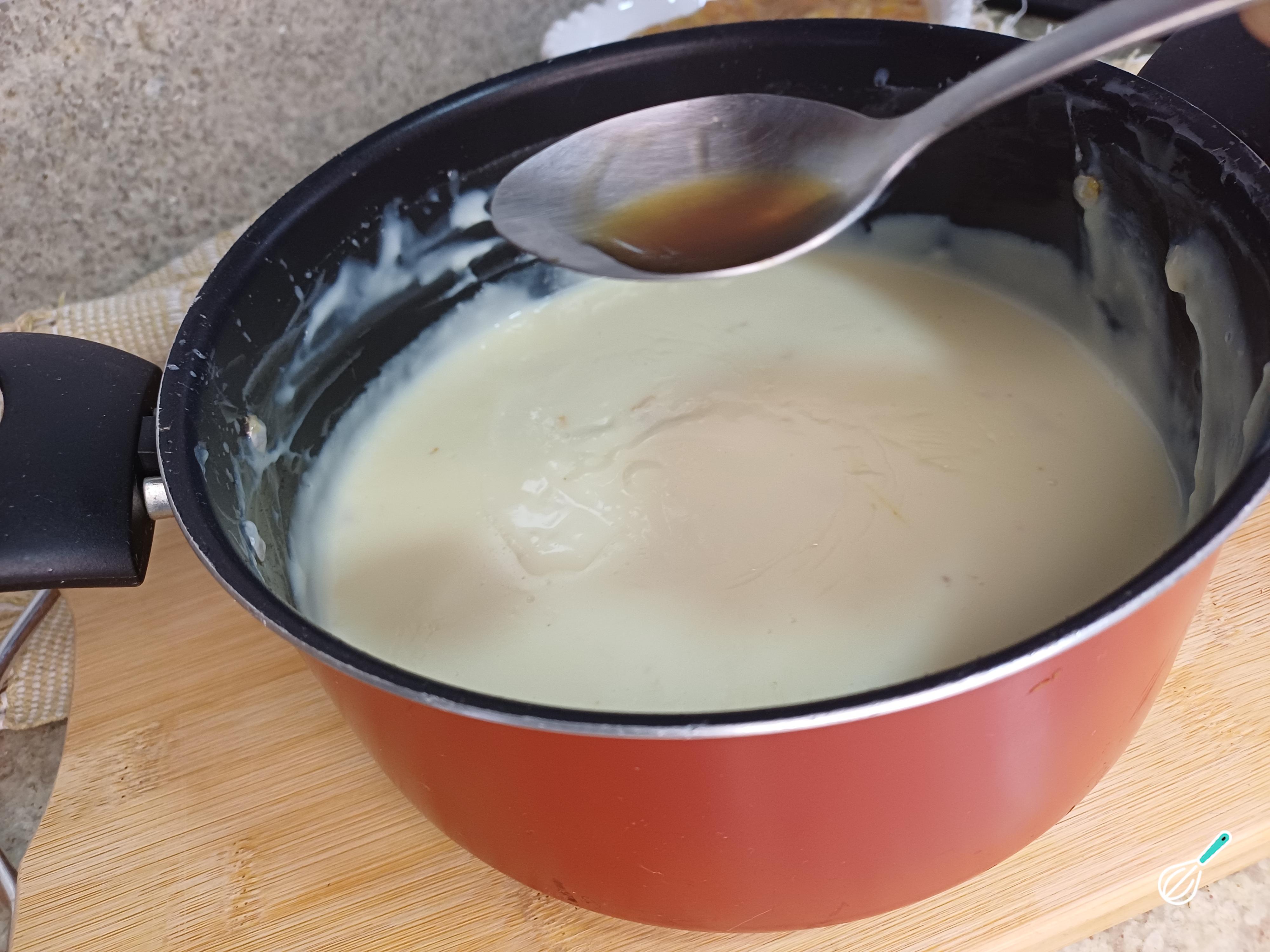 Desligue o fogo e acrescente a essência de baunilha e cubra com um plástico filme, para não formar película, até esfriar completamente.