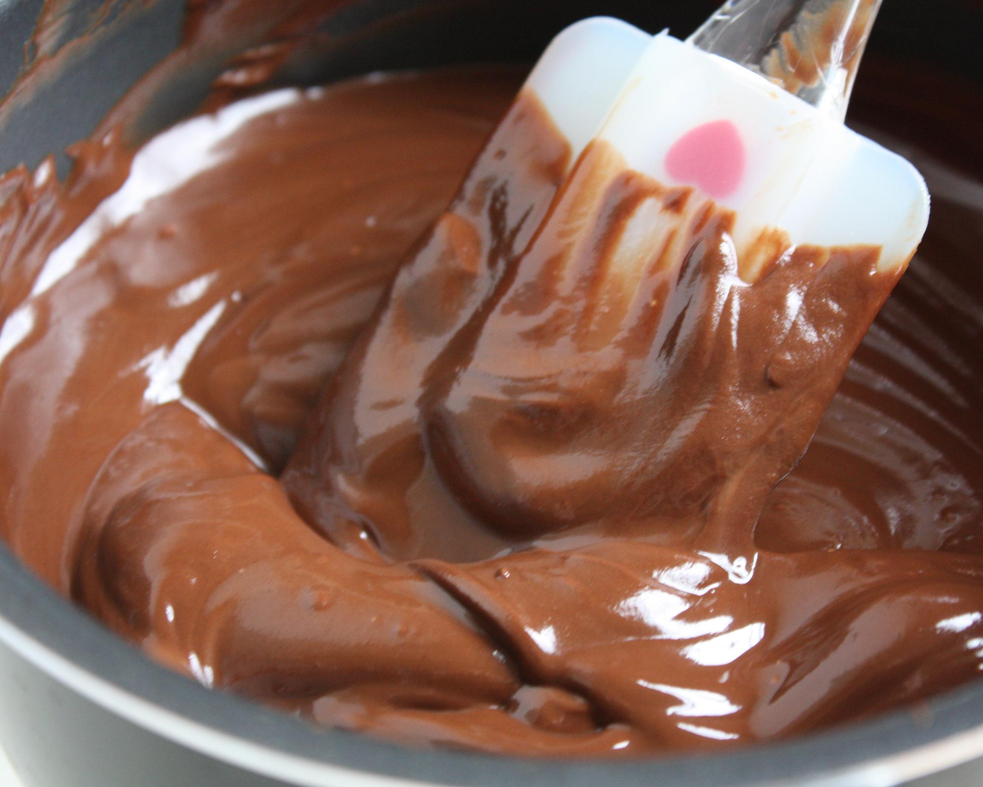 Na parte que ficou na panela você deve misturar o resto dos ingredientes: o creme de leite, o chocolate em pó e o chocolate picado. Leve de novo ao fogo, desta vez por mais ou menos 5 minutos, mexendo para dissolver os ingredientes e engrossar.