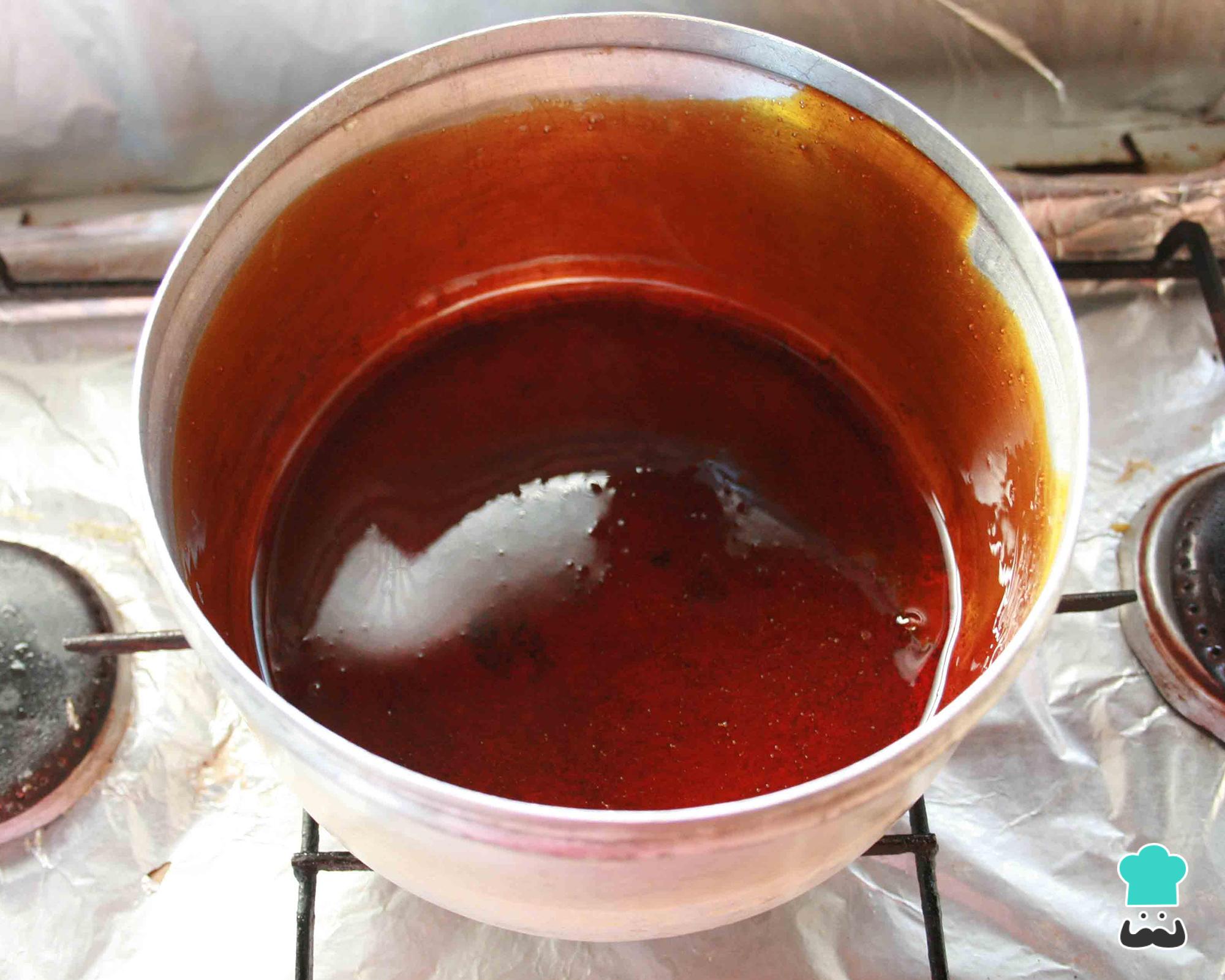 Prepare o caramelo diretamente na forma em que vai cozinhar a sobremesa - recomendamos usar uma forma em inox. Coloque nela o açúcar e a água e leve ao fogo alto até o açúcar derreter e virar caramelo um caramelo marro, como na foto. Depois desligue o fogo e espalhe o caramelo por toda a forma.