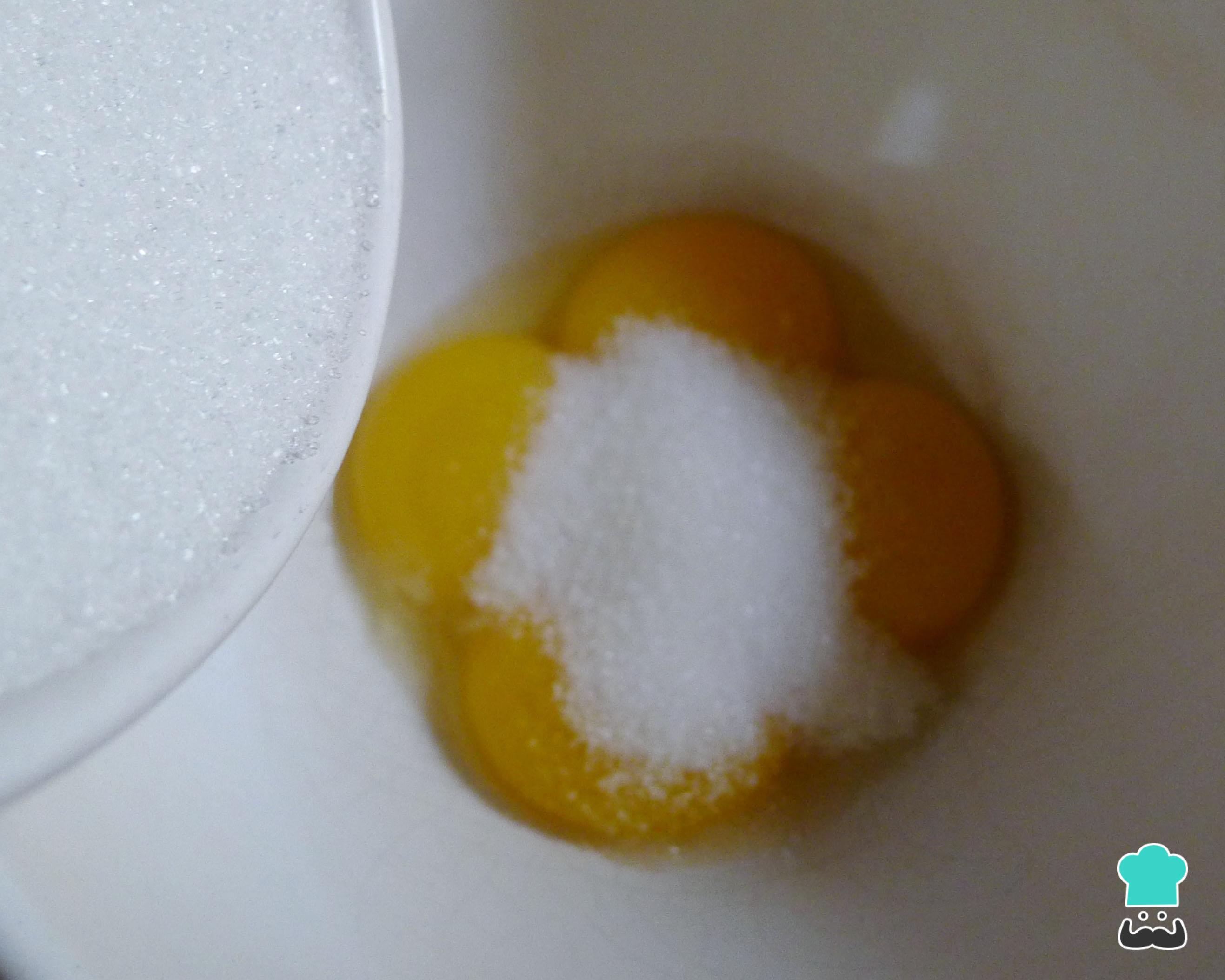 Separe as gemas das claras, reserve as claras na geladeira e coloqueas gemas de ovo numa tigela. Adicione o açúcar e bata até ficar cremoso. Pode fazer isso na mão, porém será mais rápido se usar a batedeira.