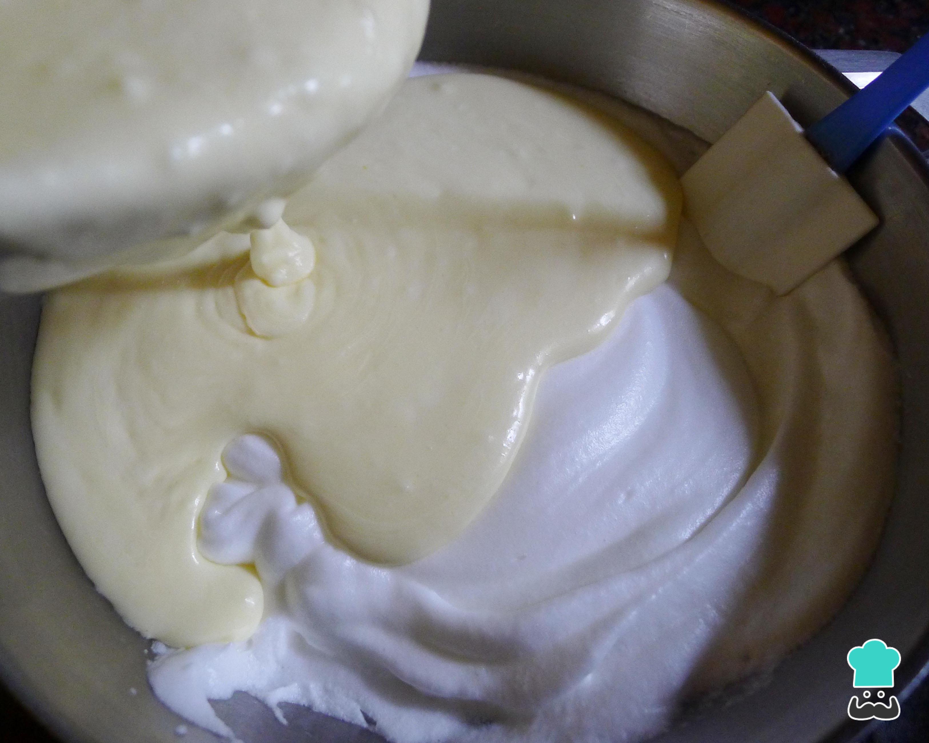 Retire as claras de ovo da geladeira e bata com uma pitada de sal ou algumas gotas de suco de limão até ficarem bem firmes (em ponto neve). Adicione um pouco do creme do passo anterior e misture delicadamente. Continue adicionando o creme e misturando, em 2 ou 3 partes.