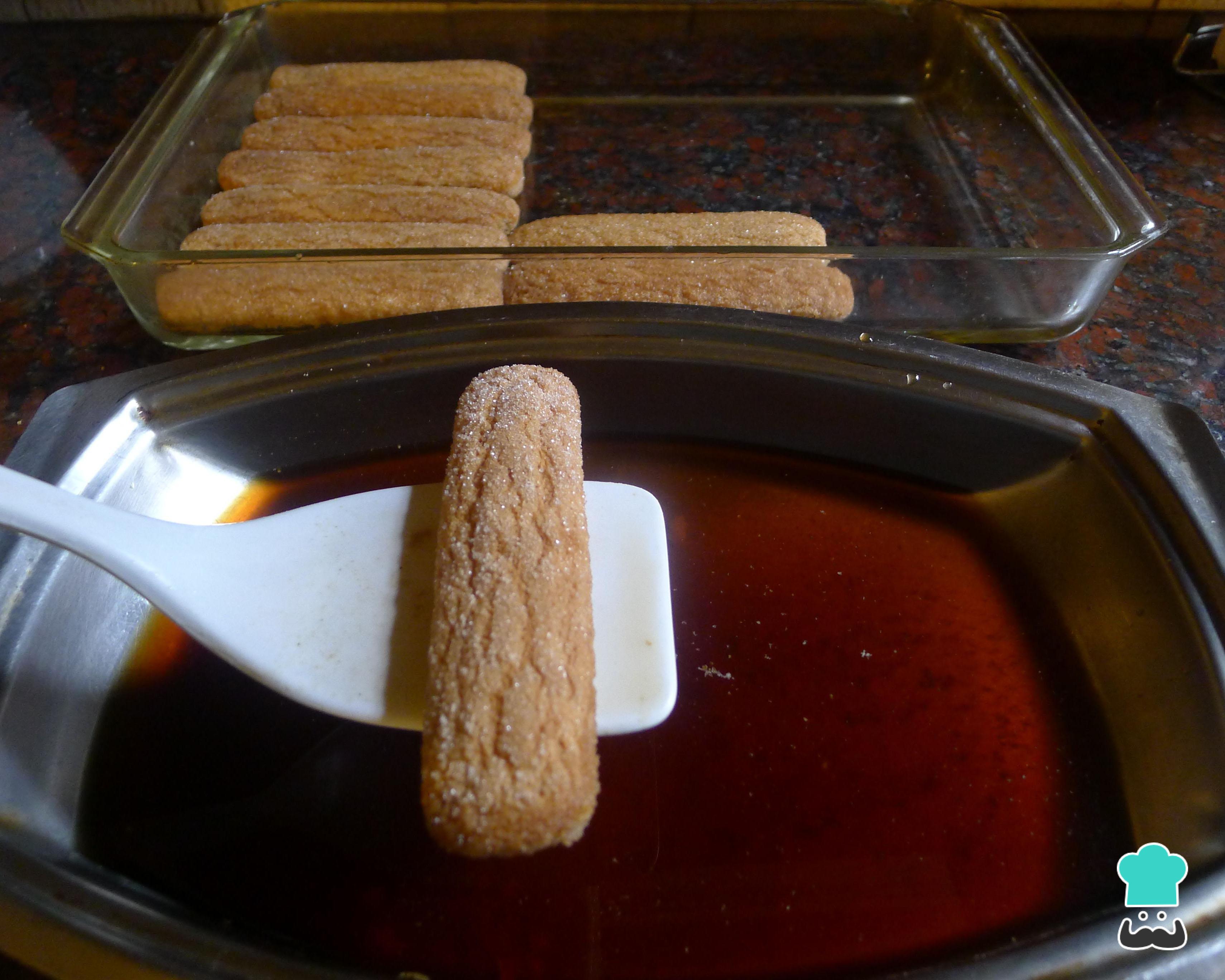 Em seguida comece a montagem do tiramisù: num recipiente misture o café com o conhaque ou rum e umedeça os biscoitos um a um, cuidando para que não se desfaçam. Coloque numa assadeira, de preferência de vidro e retangular até preencher todo o fundo.