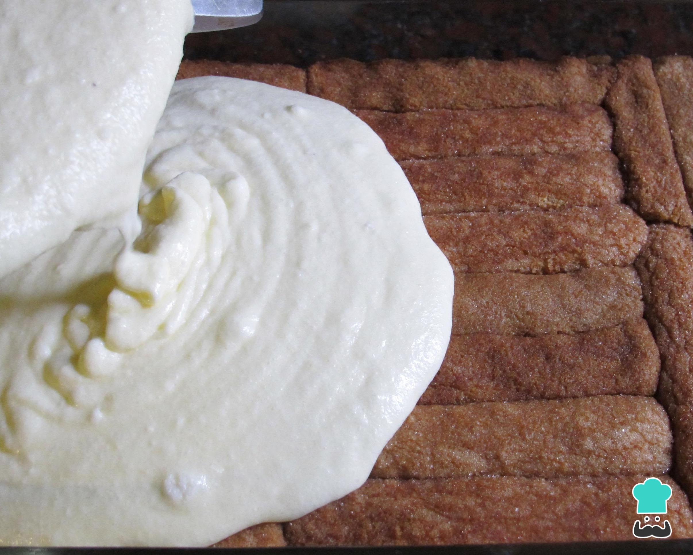 Em seguida cubra os biscoitos com o creme de tiramisù e espalhe bem com uma espátula ou colher. Reserve o tiramisù na geladeira por 4 a 6 horas, tempo necessário para que fique firme, geladinho e com os biscoitos bem úmidos.