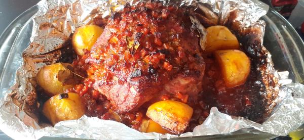 Asse a sobrepaleta no forno nos 180ºC por 30-40 minutos e retire. Espere 5 minutos antes de fatiar e sirva em seguida. Delicie-se com esta deliciosa receita de carne de porco diferente e diga nos comentários o que você achou. Bom apetite!
