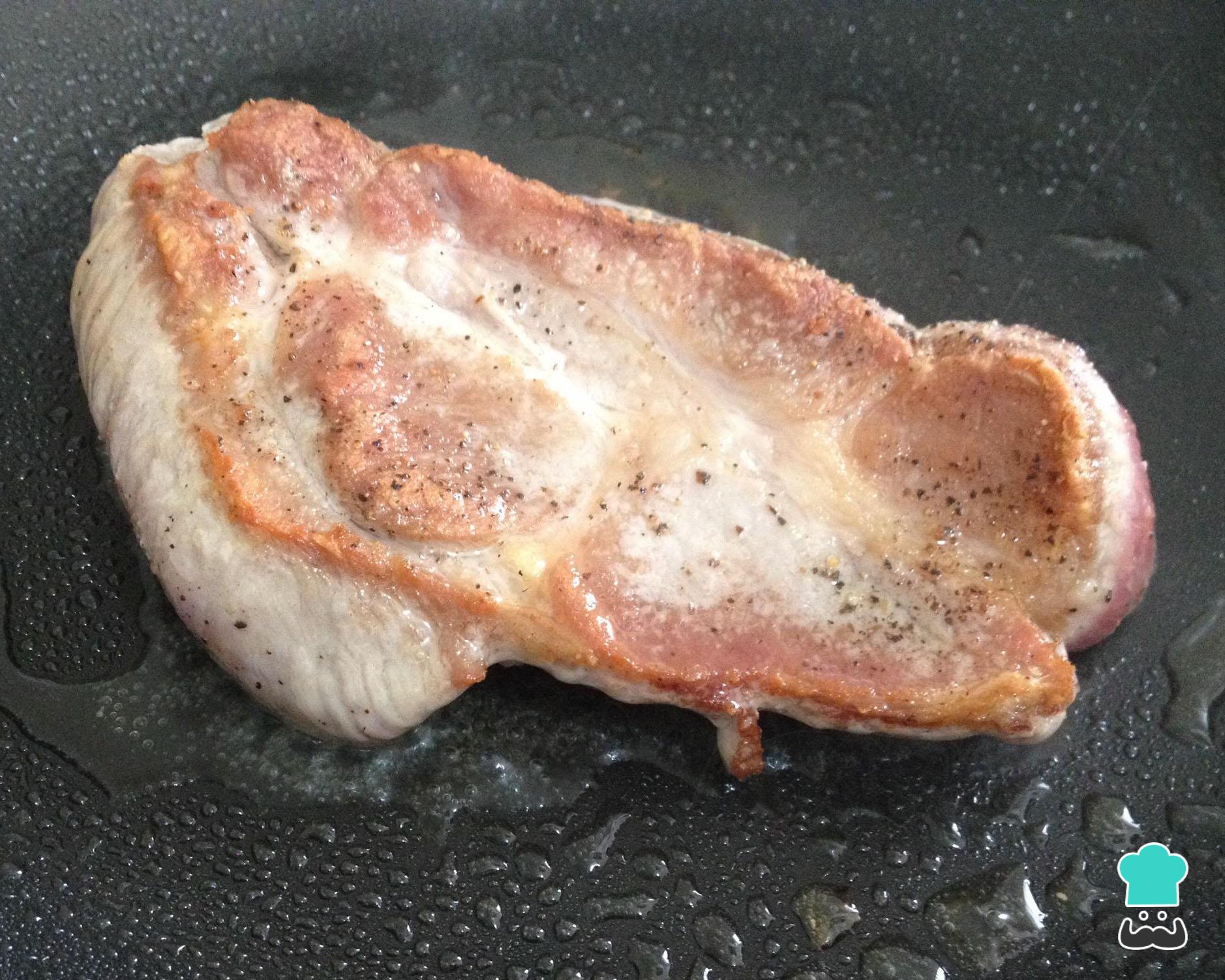 Leve ao fogo uma frigideira um o azeite ou óleo e, quando estiver quente, doure a carne suína de todos os lados. Quando estiver douradinha, retire para um prato.