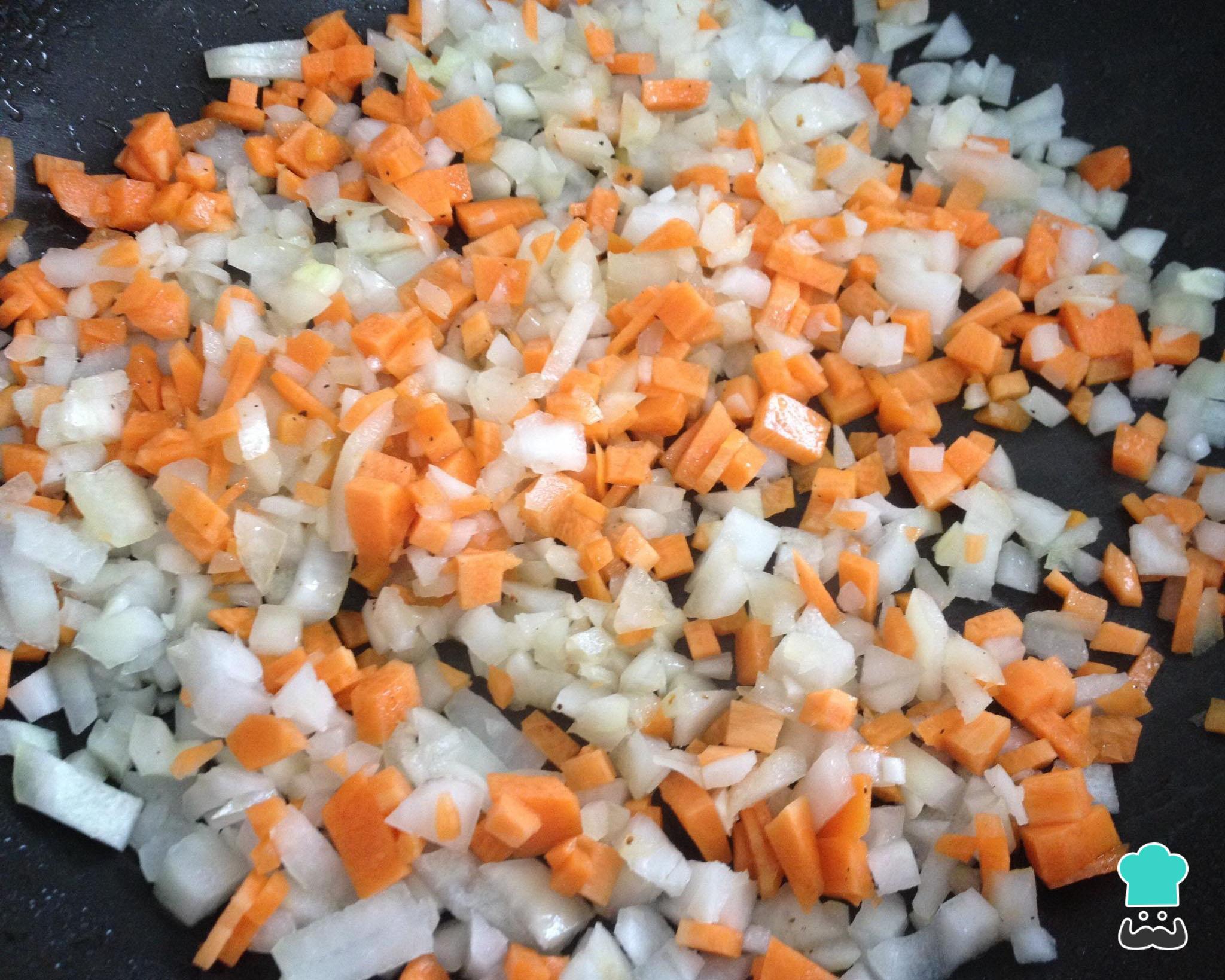 Adicione a cebola e a cenoura picadas na frigideira onde dourou a carne e deixe cozinhar até ficarem macias, mexendo de vez em quando para não queimar.
