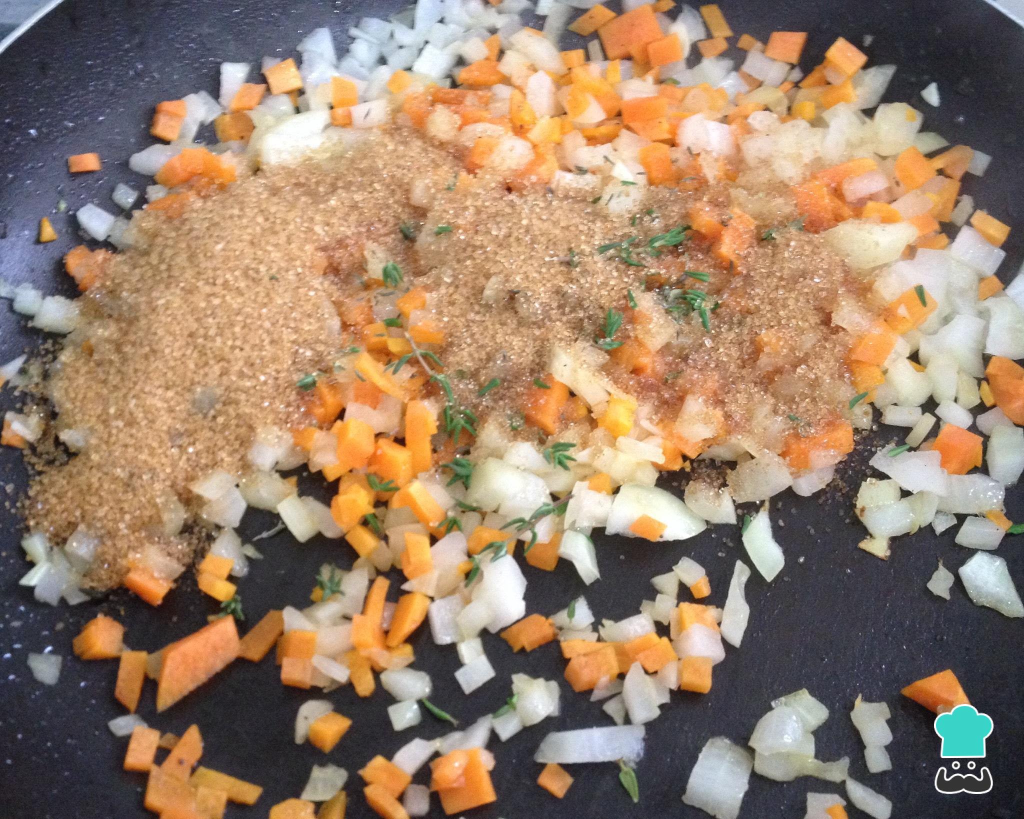 Em seguida, para conseguir mais sabor nesta receita de sobrepaleta de porco, adicione o açúcar e o tomilho na frigideira.