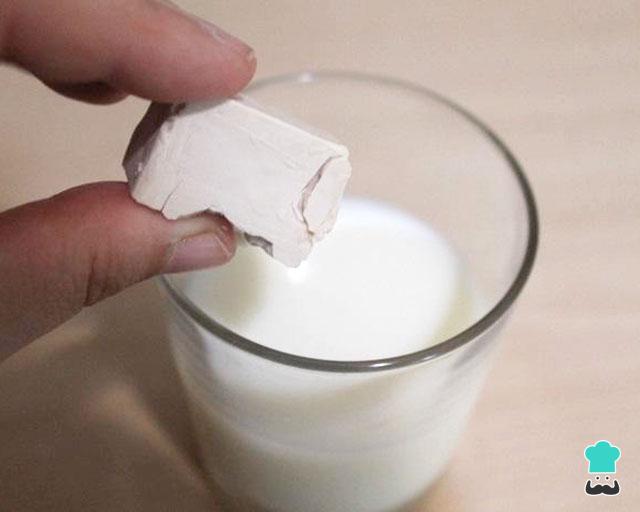 Para fazer essa receita de sonho de padaria comece por dissolver o fermento no leite morno. Numa tigela ou no bowl da batedeira planetária (com gancho para pão) coloque a farinha e o açúcar e misture.
