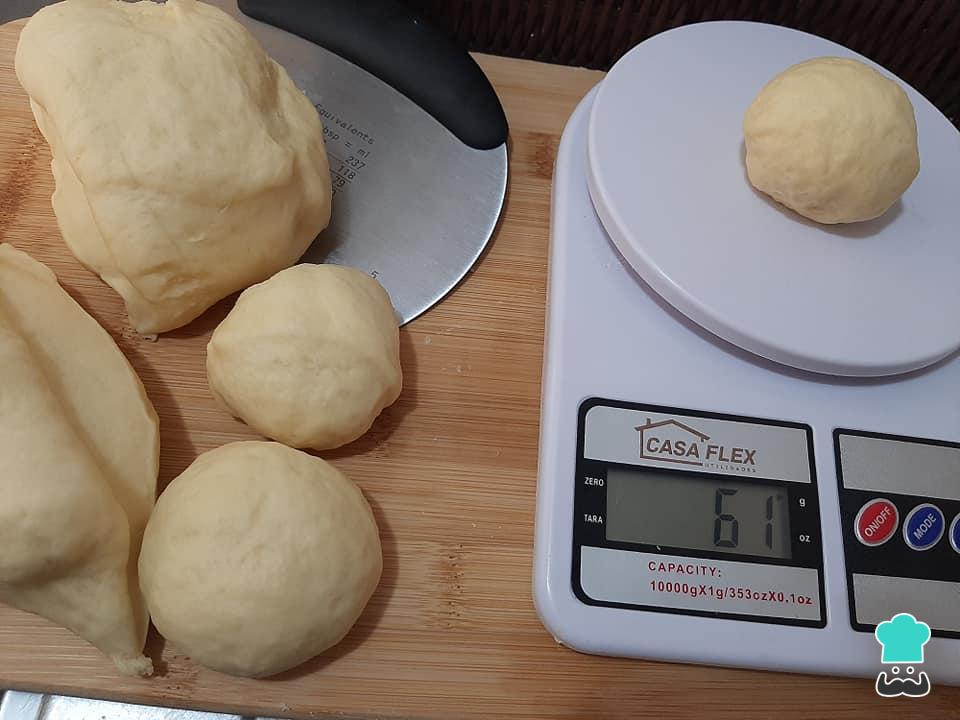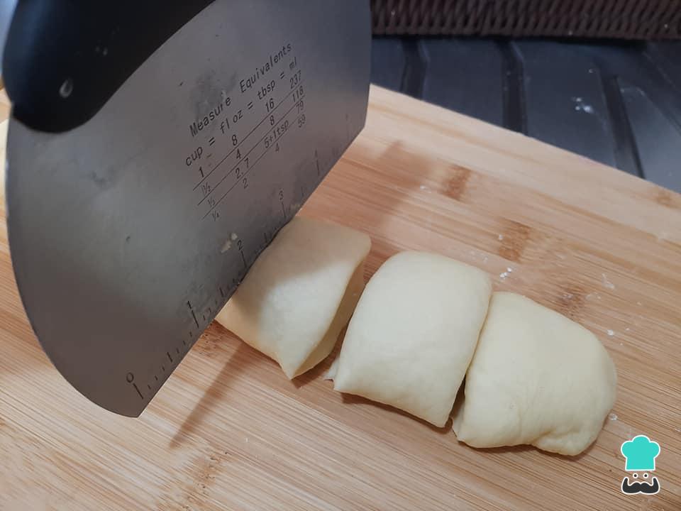 Depois que a massa crescer, corte-a em 15-16 pedaços do mesmo tamanho.