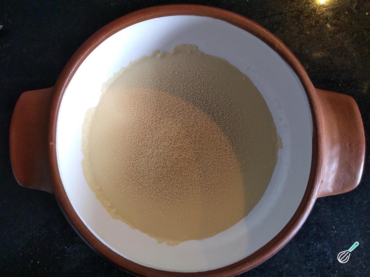 Dissolva o fermento no leite morno e espere que forme uma espuminha. Isso significa que o fermento está ativado, o que demora, aproximadamente, uns 20 minutos, dependendo da temperatura ambiente.