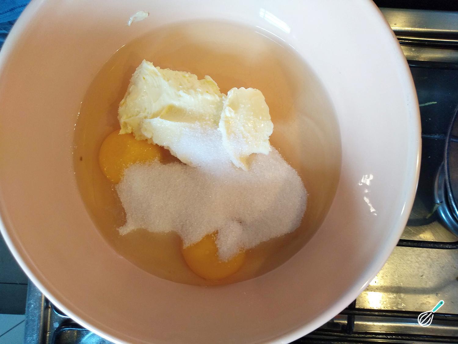 Em outro recipiente adicione os ovos, o açúcar, a manteiga e misture todos esses ingredientes. Você pode utilizar o fouet elétrico para fazer a massa desse sonho caseiro frito mais rápido.