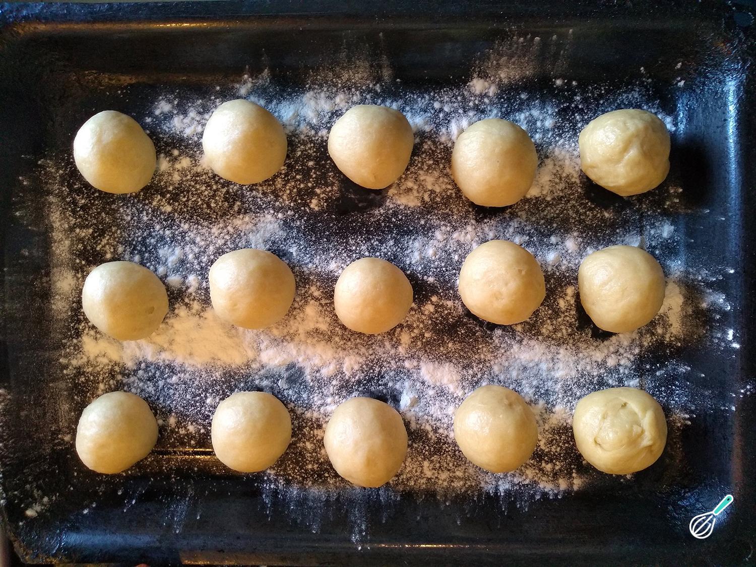 Quando essa etapa da massa para sonho frito estiver pronta, forme bolinhas. Coloque-as sobre uma bandeja com papel vegetal ou farinha, para evitar que fiquem grudadas, deixando algum espaço de separação entre elas. Deixe repousar até dobrarem de volume novamente (desta vez por 25-30 minutos).