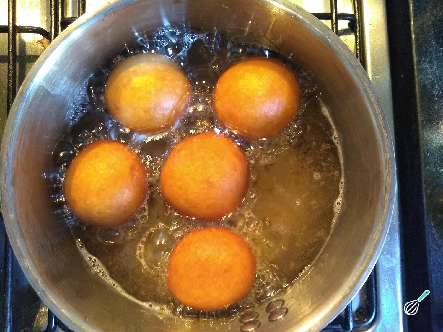 Em seguida, frite as bolinhas de sonho em uma panela cheia de óleo quente. Fique girando as bolinhas de massa de sonho para que dourem uniformemente.