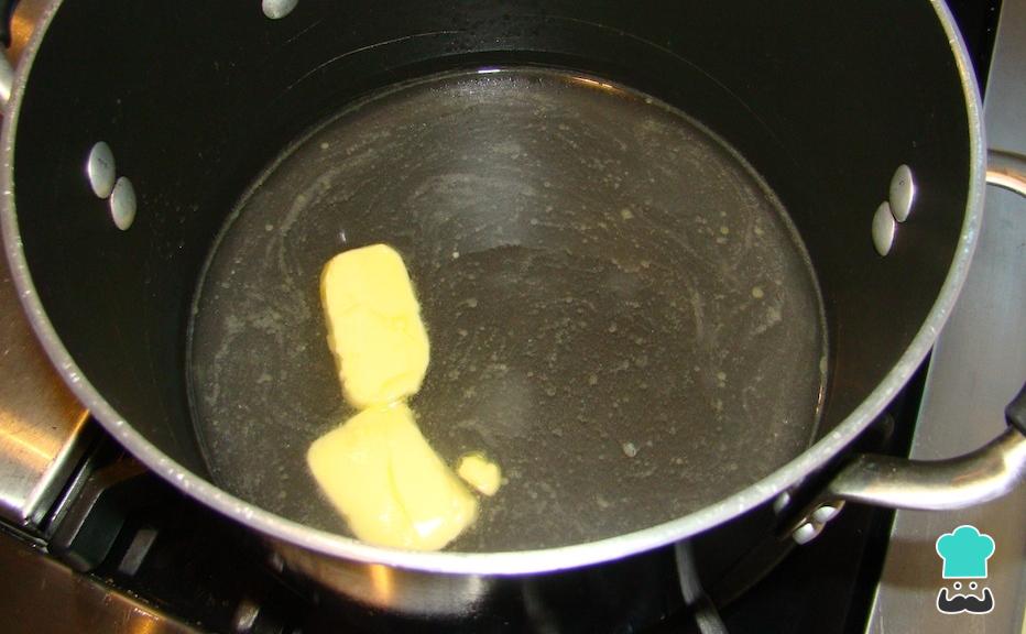 Para preparar esta receita de Carnaval, o primeiro passo é levar ao fogo médio uma panela com a água, a manteiga e o sal e esperar ferver.
